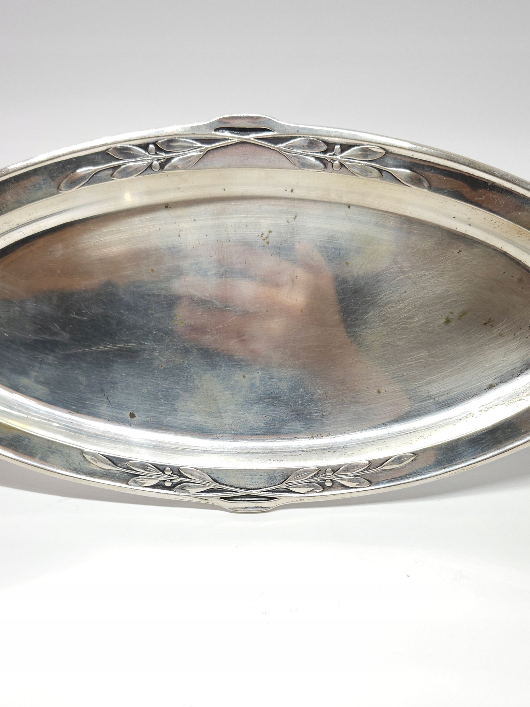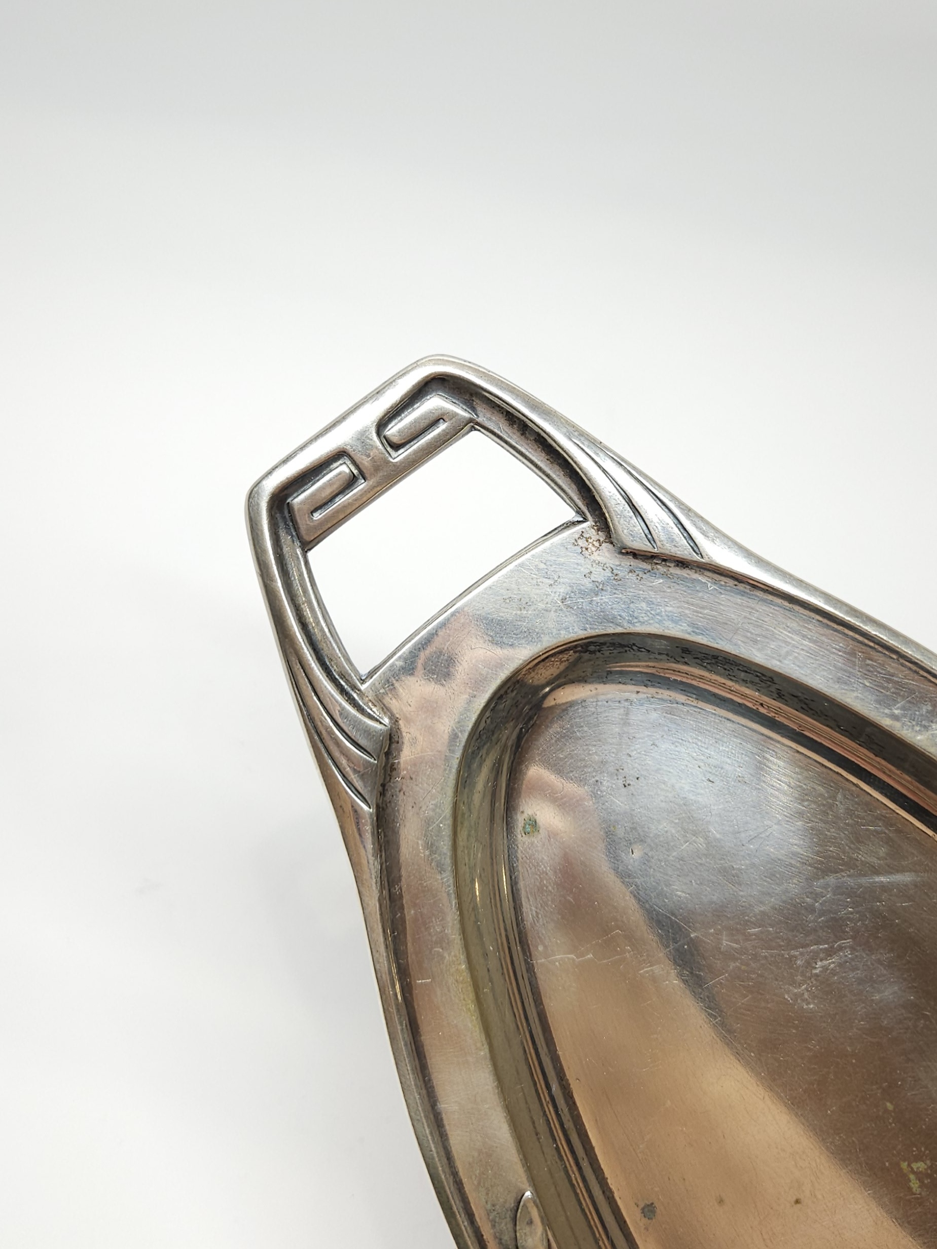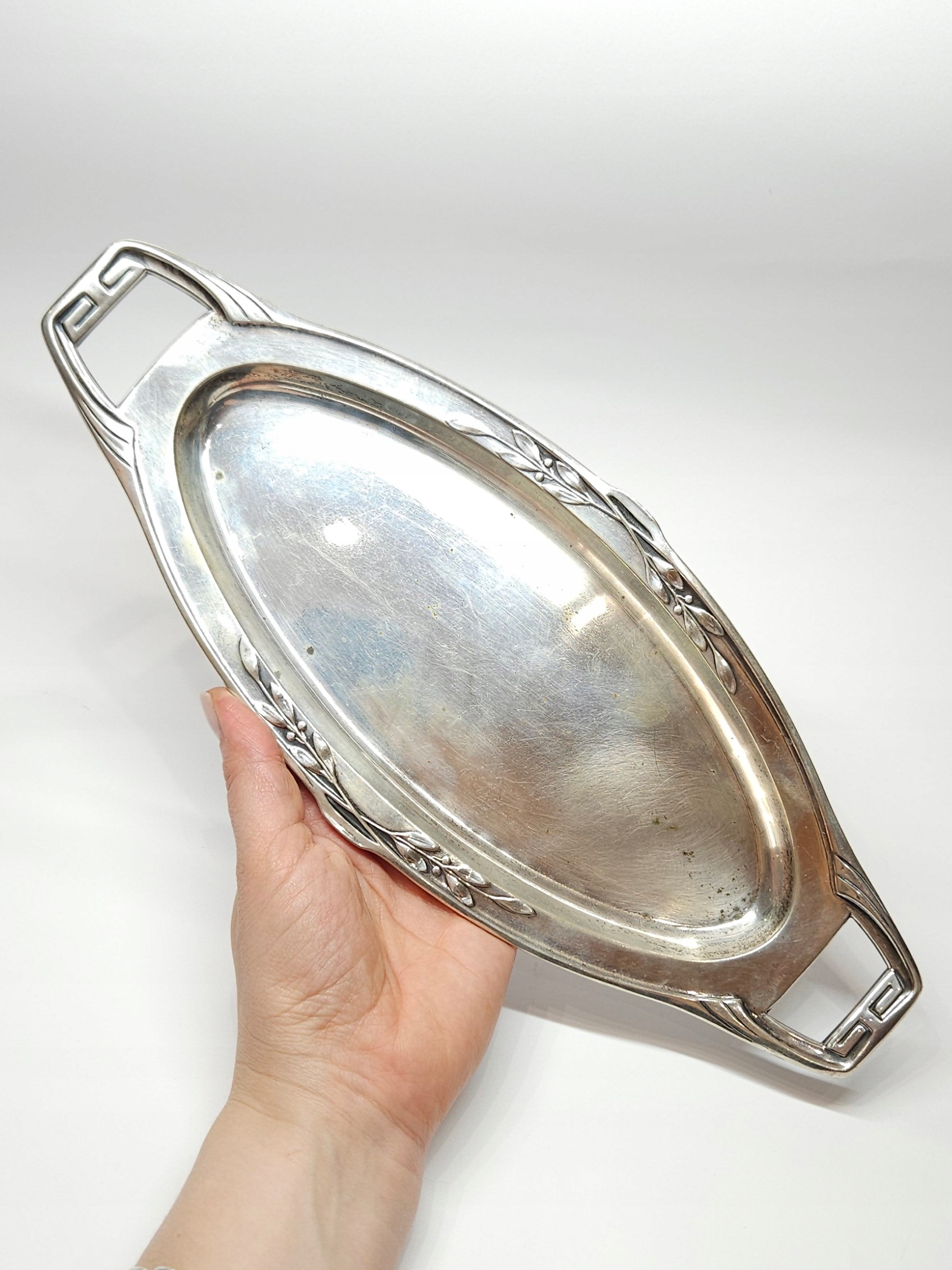 Podłużna, srebrna tacka z pocz. XXw., zdobiona secesyjnym motywem dekoracyjnym, mogąca służyć jako podstawka ood karafkę z kieliszkami lub przybornik toaletkowy… organizer na biurko; z racji wieku możliwe drobne mikroryski i miejscowe przyciemnienia srebra