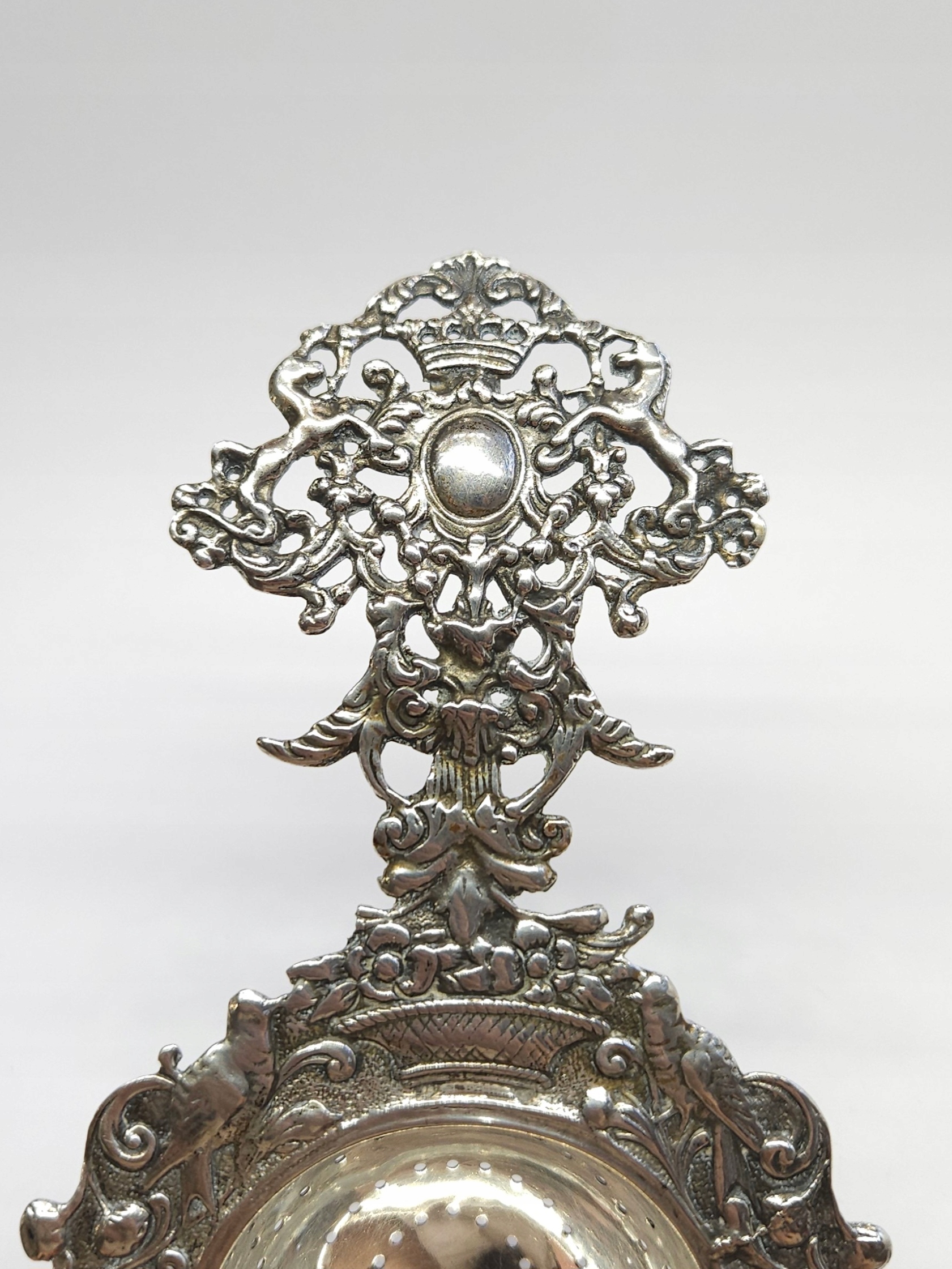 Srebrne sitko, zdobione bogatym, ażurowym ornamentem dekoracyjnym z motywami zwierzęcymi i roślinnymi, z uchwytem z owalnym polem na inicjały pod koroną; z racji wieku widoczne drobne odkształcenia
