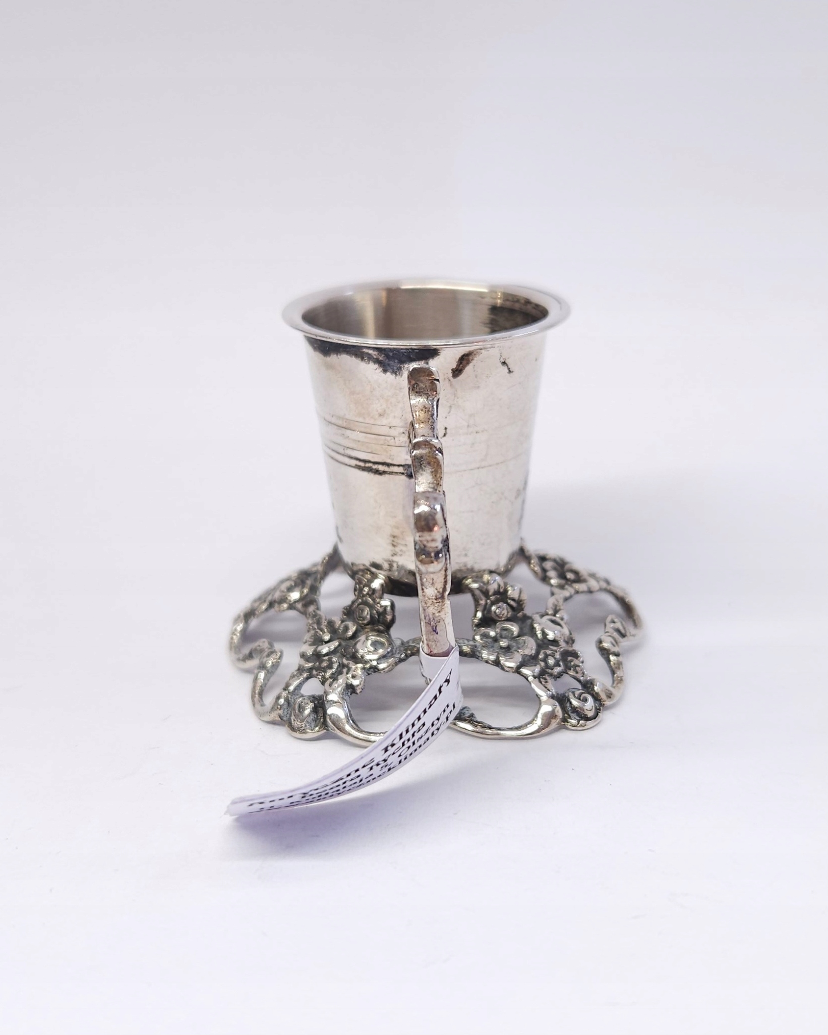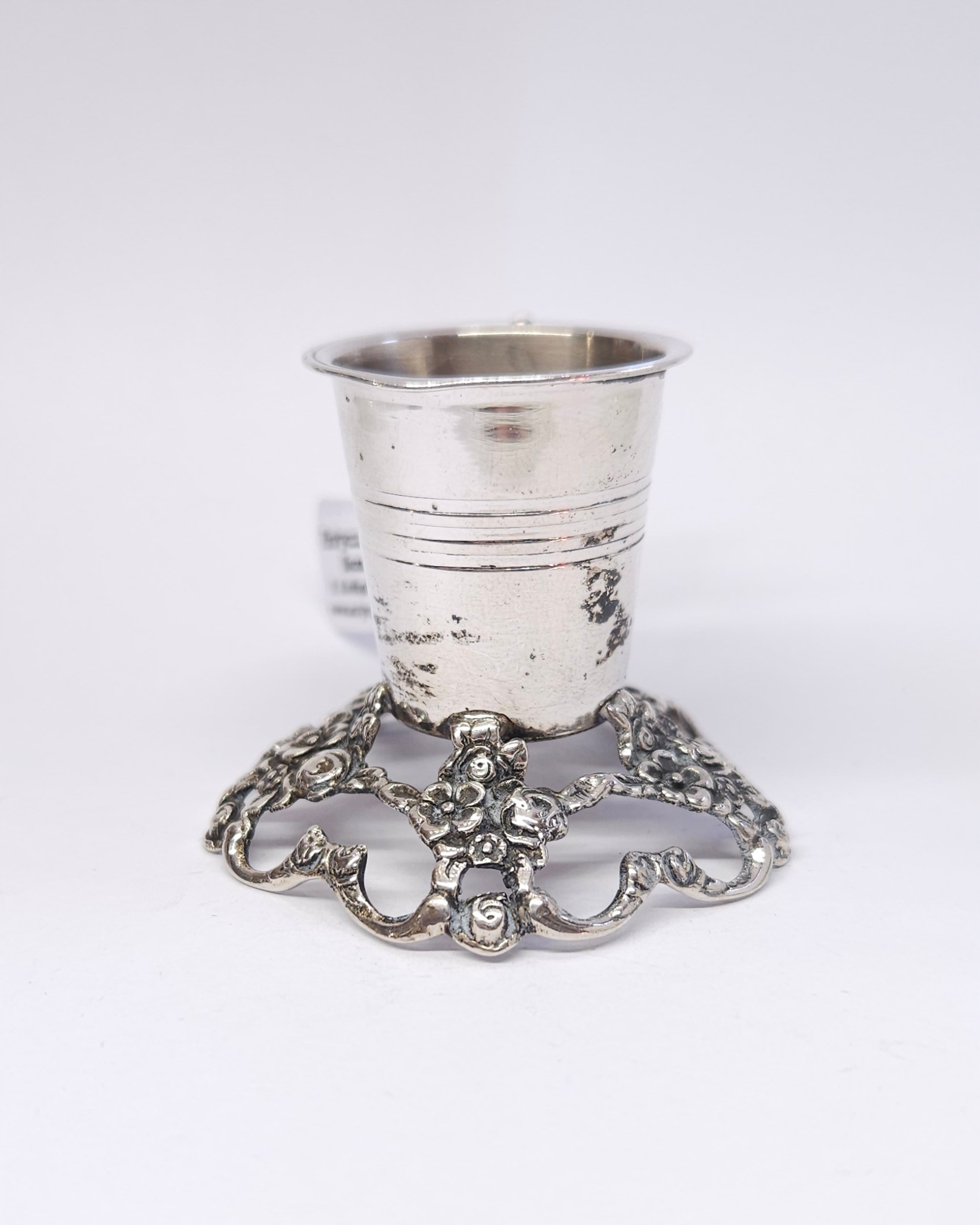 Srebrny świecznik na jedną świecę, zdobiony motywem róż, na ażurowej podstawie, z uchwytem; z racji wieku widoczne drobne odkształcenia