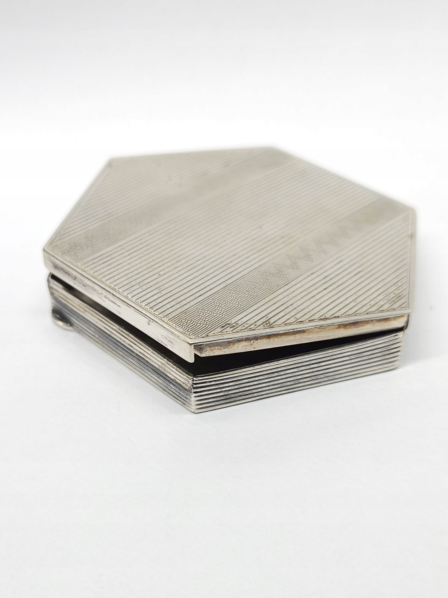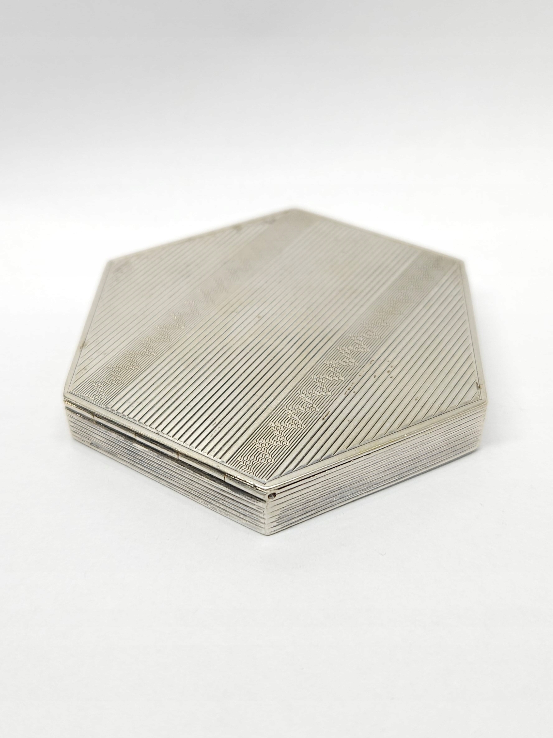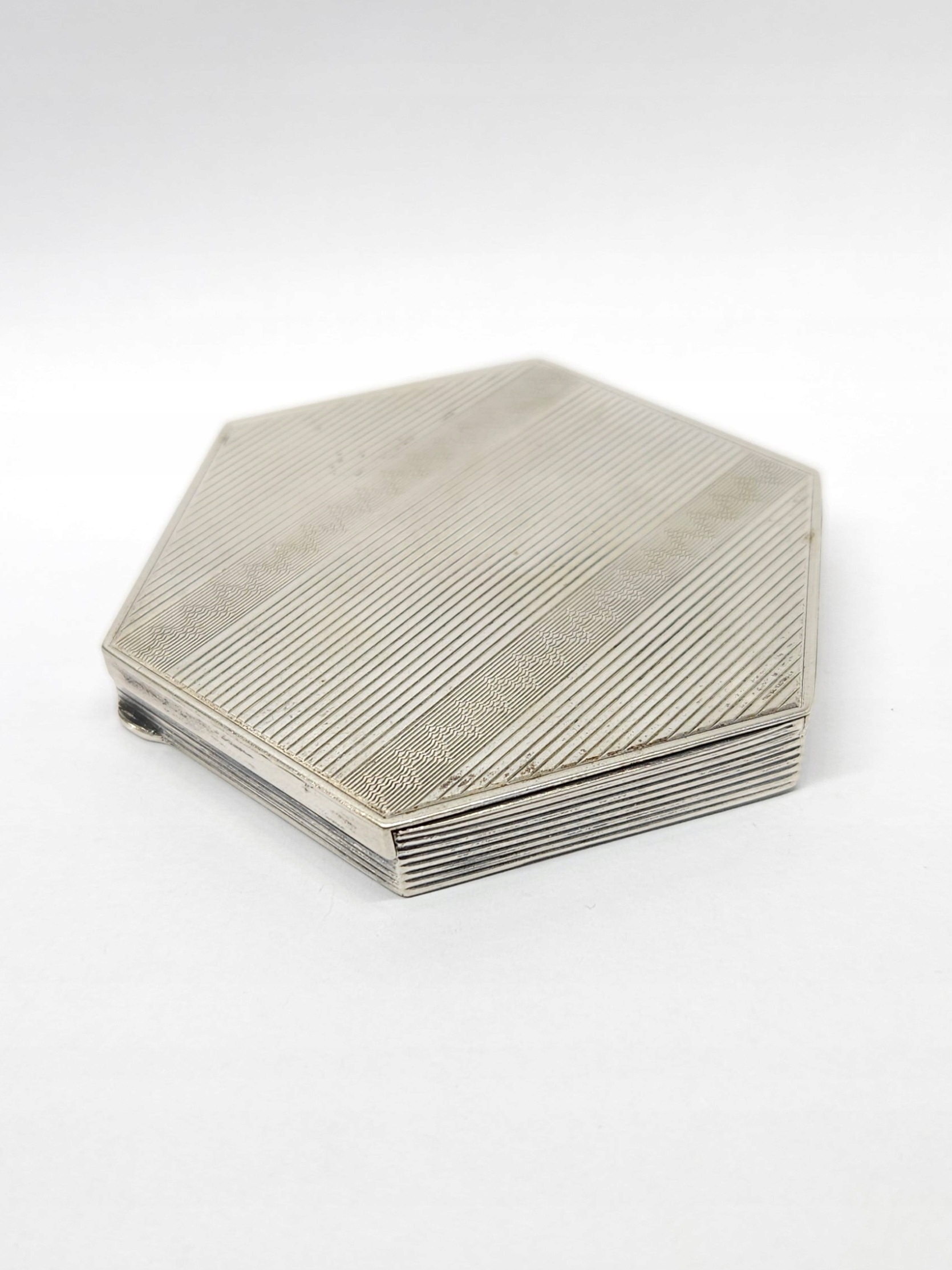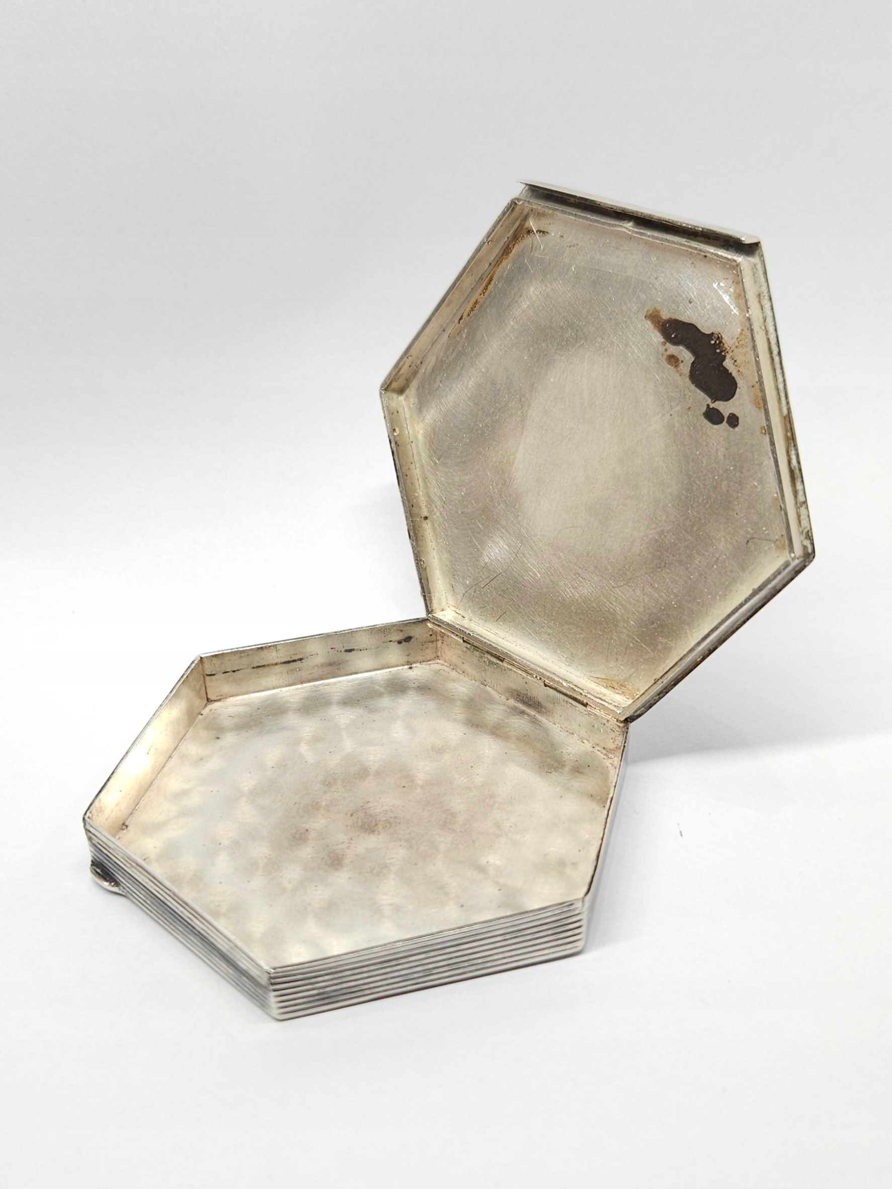 Srebrne, sześciokątne puzderko – pigularz, zdobiony techniką giloszu oraz grawerowanymi prążkami; mocne zamknięcie