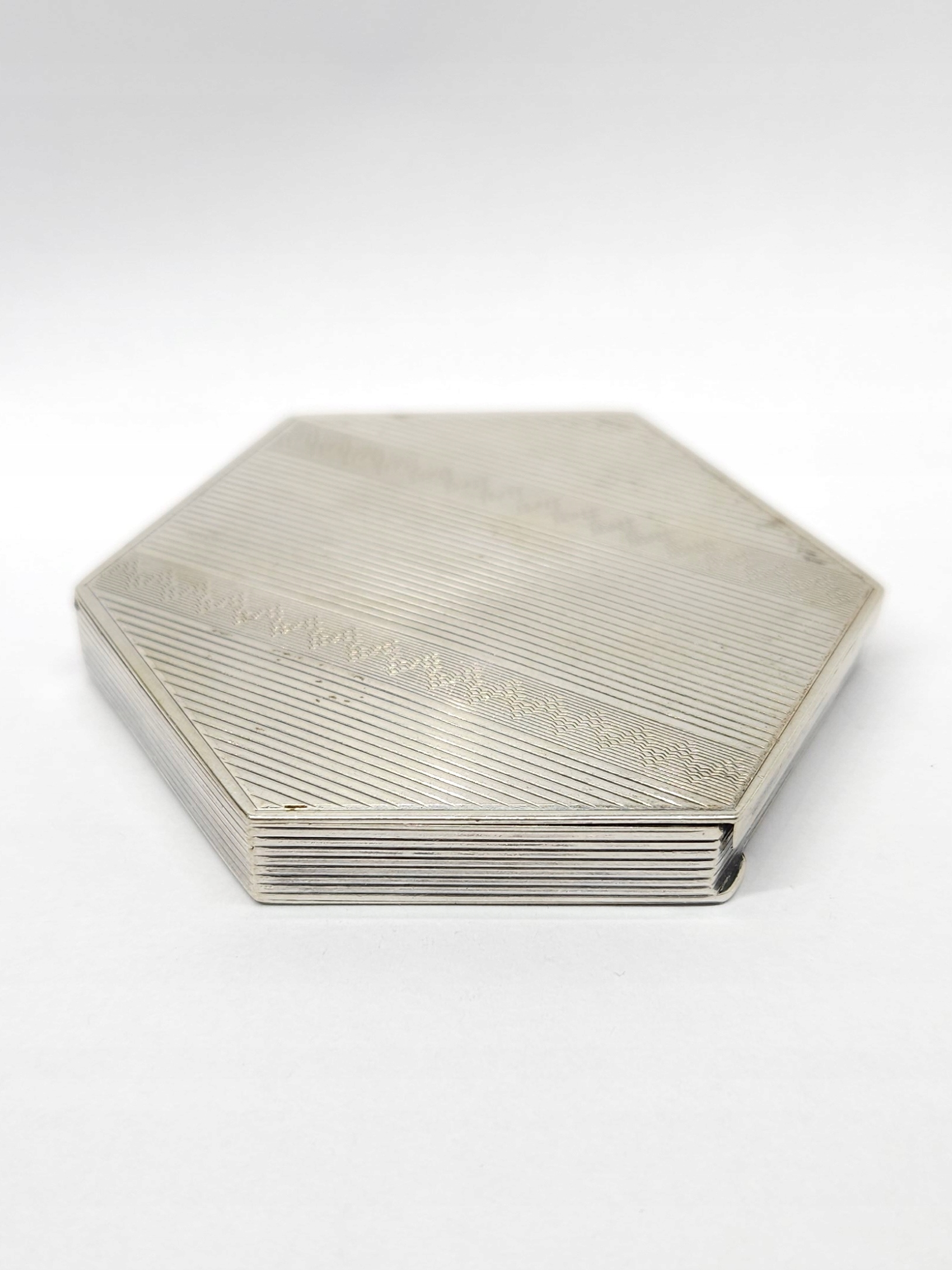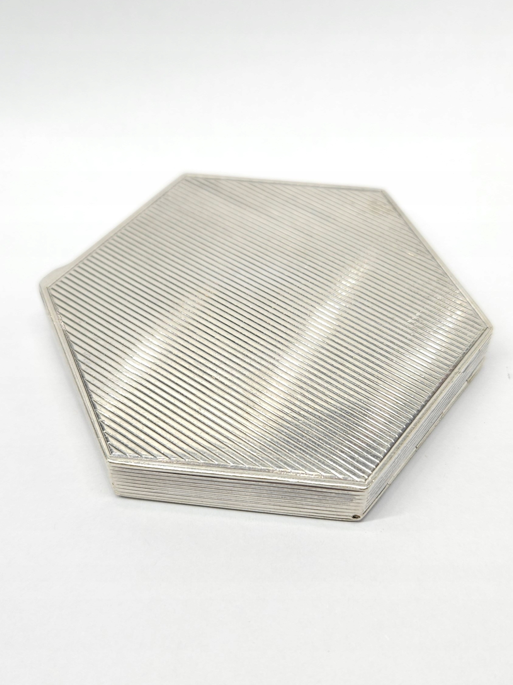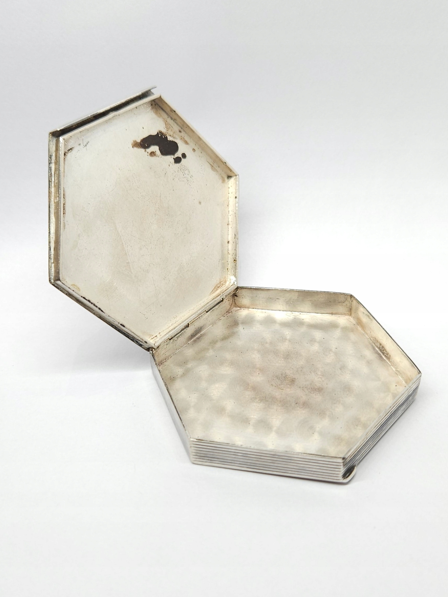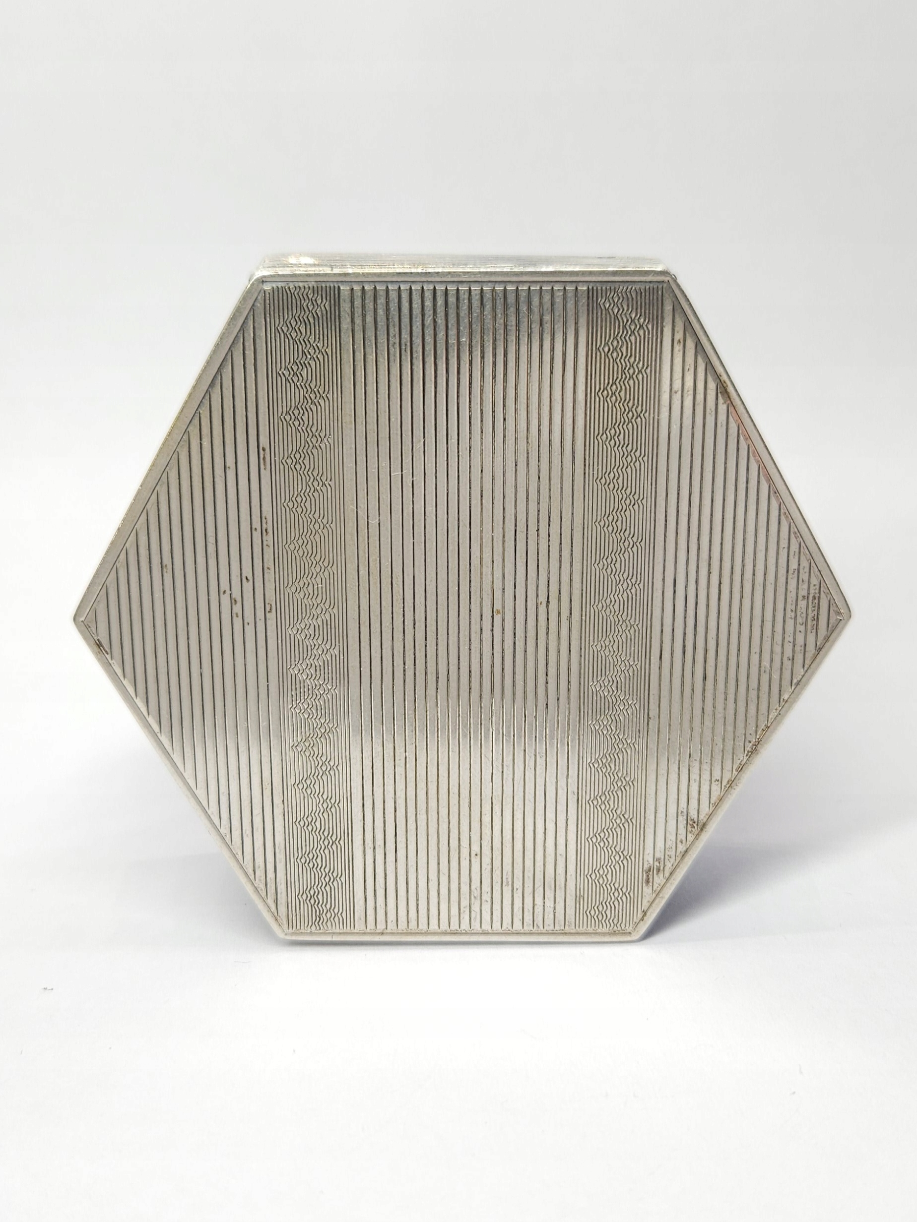 Srebrne, sześciokątne puzderko – pigularz, zdobiony techniką giloszu oraz grawerowanymi prążkami; mocne zamknięcie