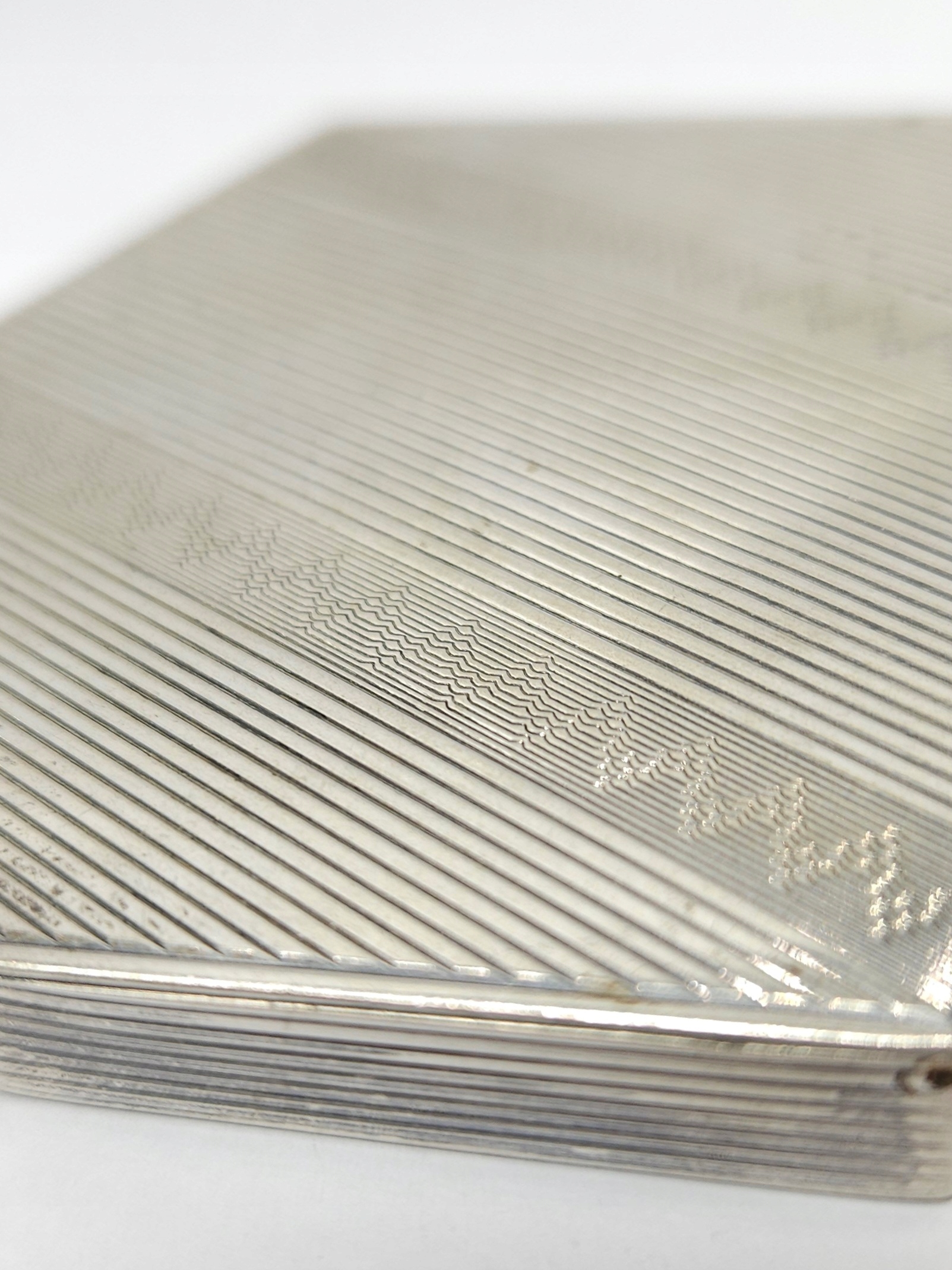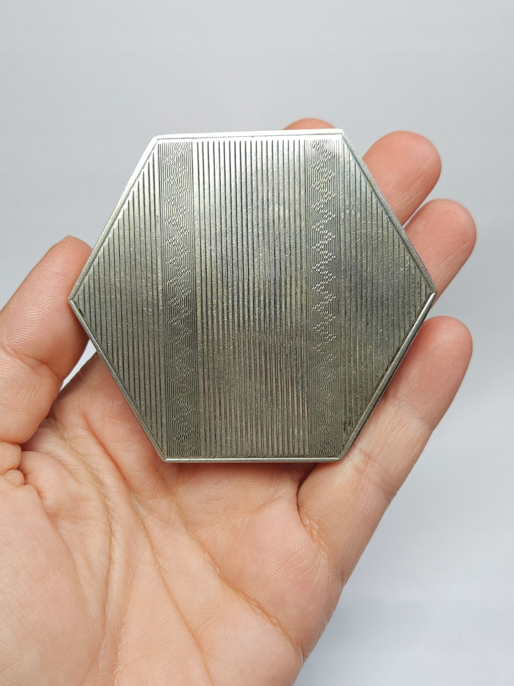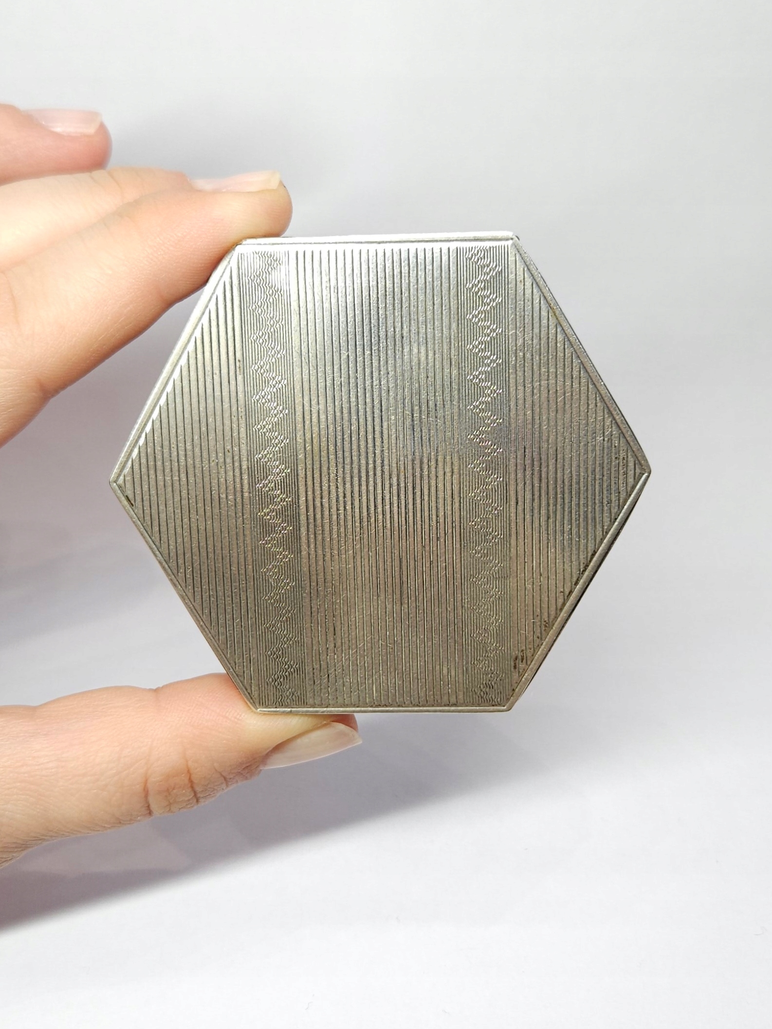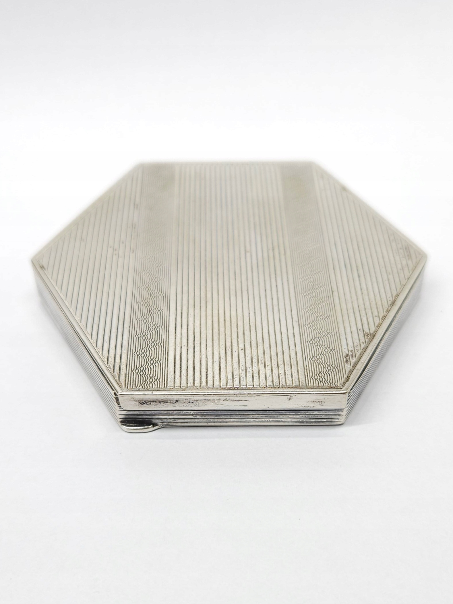Srebrne, sześciokątne puzderko – pigularz, zdobiony techniką giloszu oraz grawerowanymi prążkami; mocne zamknięcie