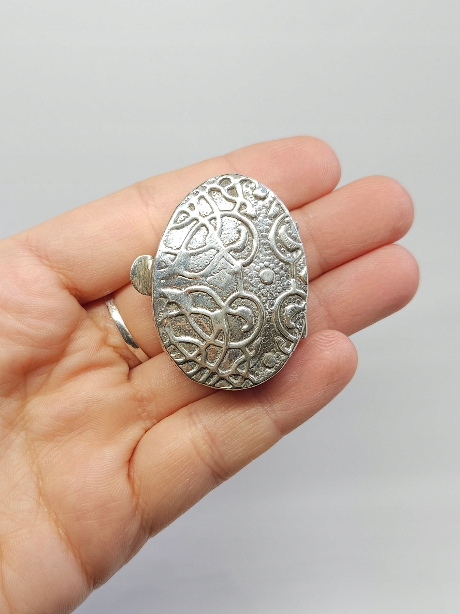 Owalne, srebrne puzderko – pigularz – pojemnik toaletowy, zdobiony tłoczonym ornamentem dekoracyjnym
