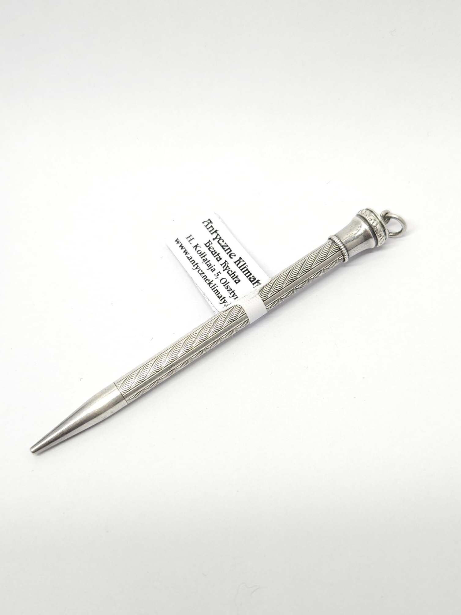 Srebrny, wykręcany ołówek do karnecika balowego, zdobiony techniką giloszu, z ogniwkiem do zawieszenia; wewnątrz mechanizm z mosiądzu, brak wkładów