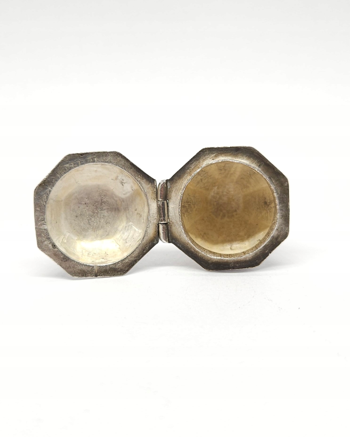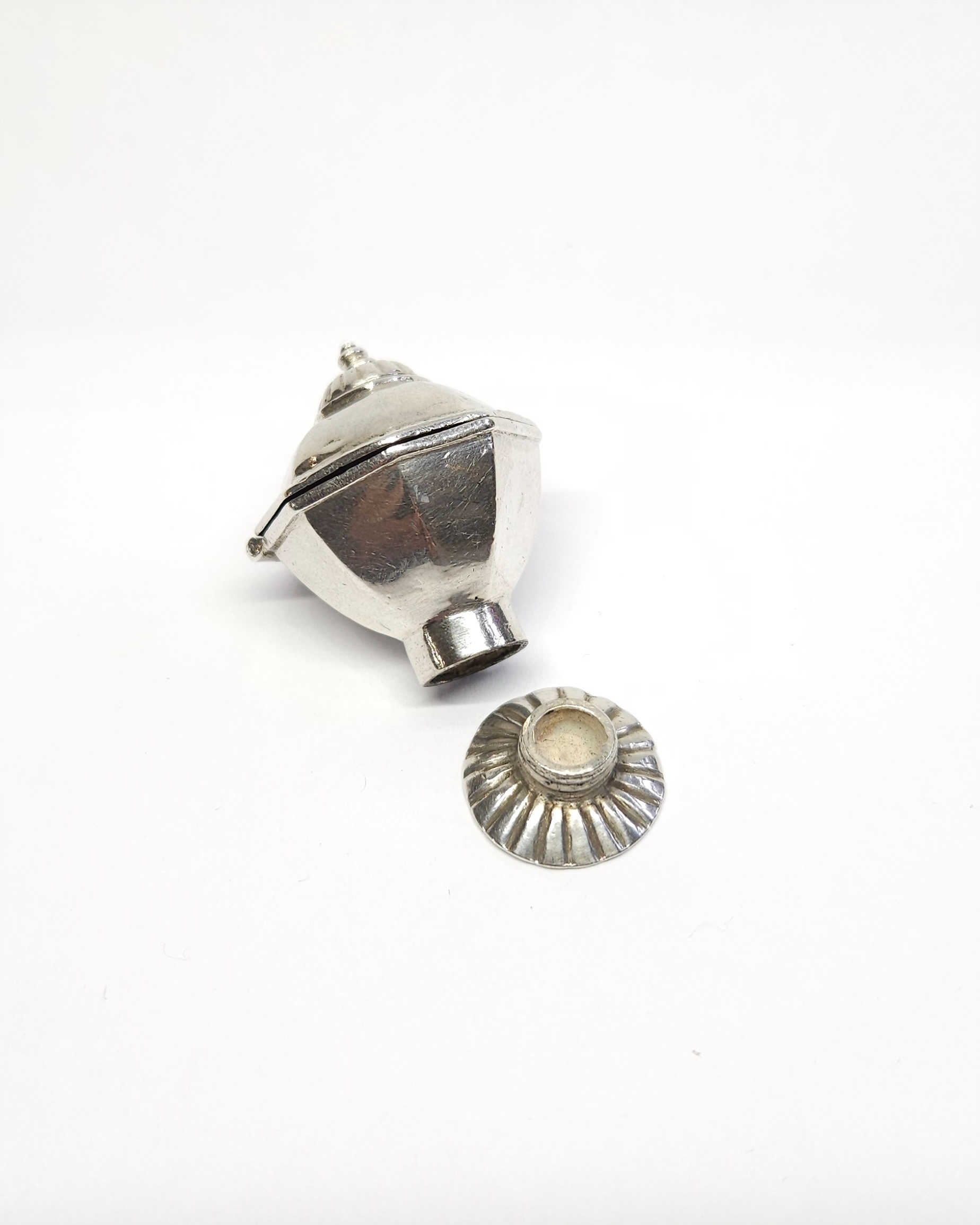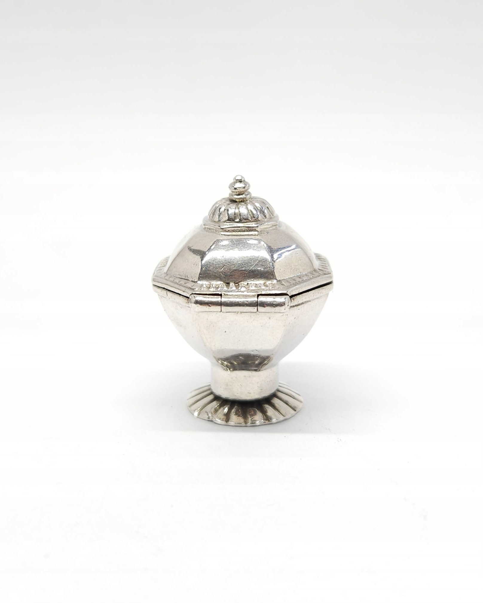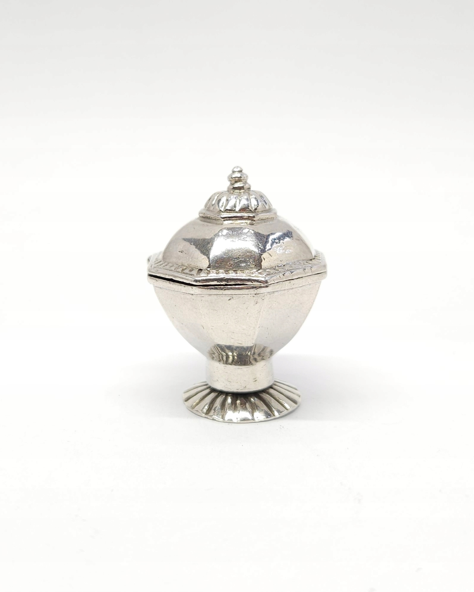 Srebrny pigularz…przyprawnik na odkręcanej nóżce, z pocz. XXw., z wielokątnym wieczkiem na zawiasie; z racji wieku pojemnik posiada drobne wgniecenia