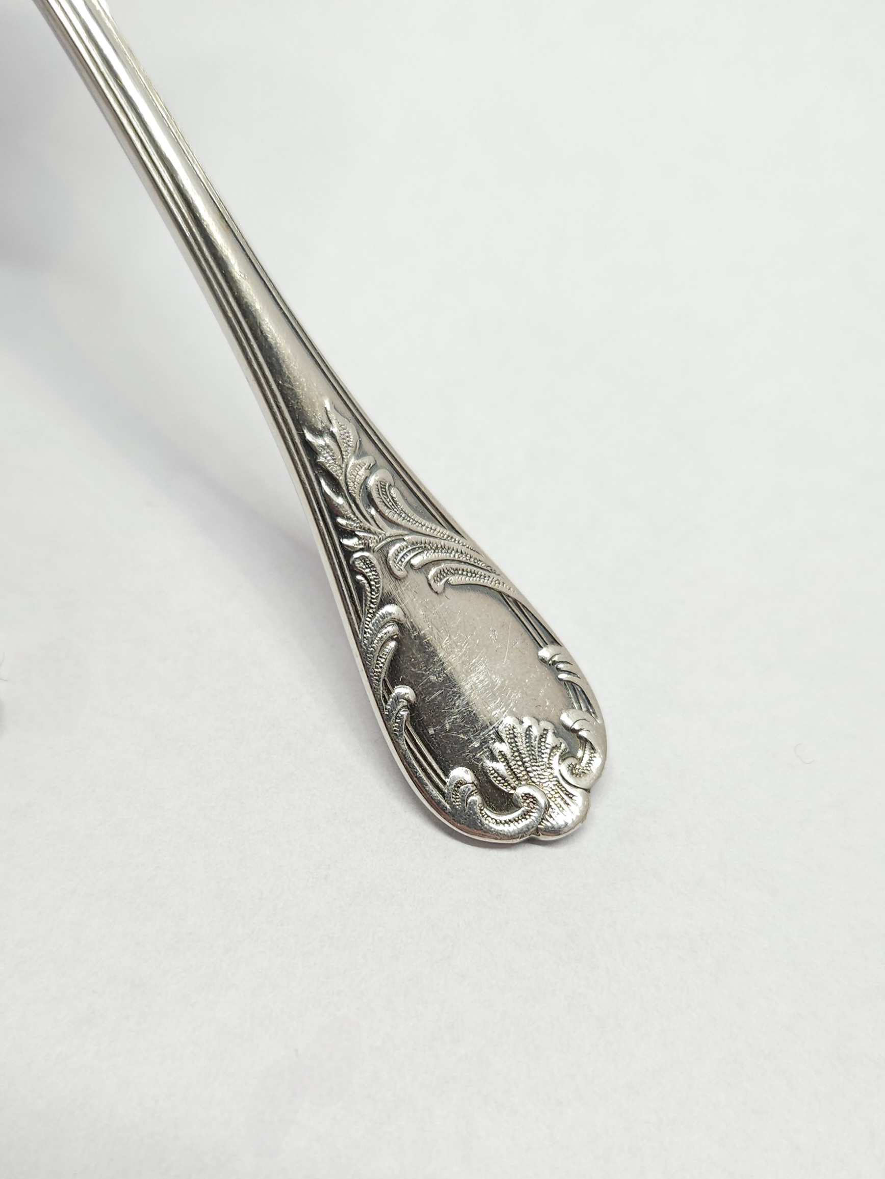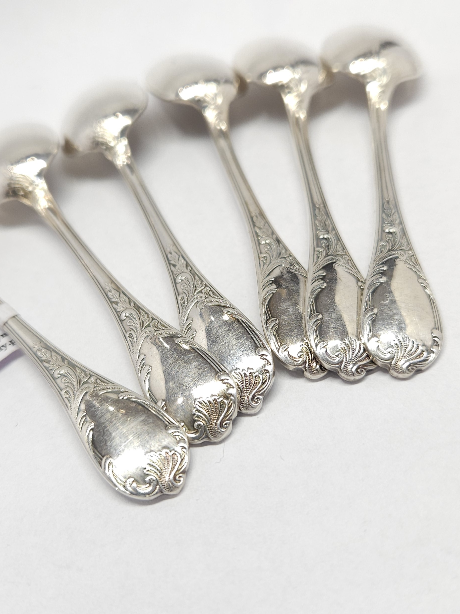 Komplet 6 szt. posrebrzanych łyżeczek, francuskiej wytwórni Christofle, z uchwytami dwustronnie zdobionymi stylizowanym, roślinnym ornamentem dekoracyjnym; z racji wieku możliwe mikroryski