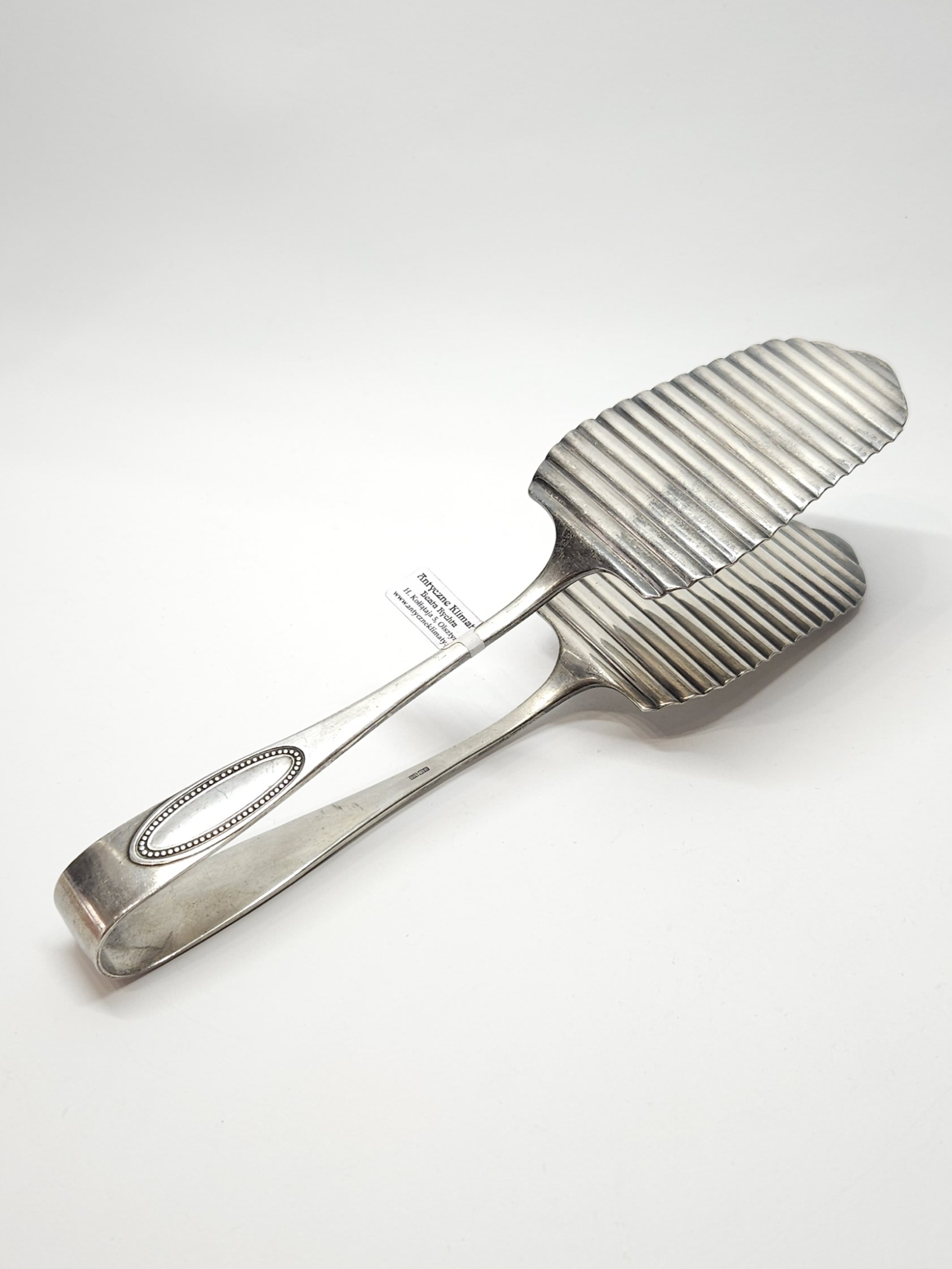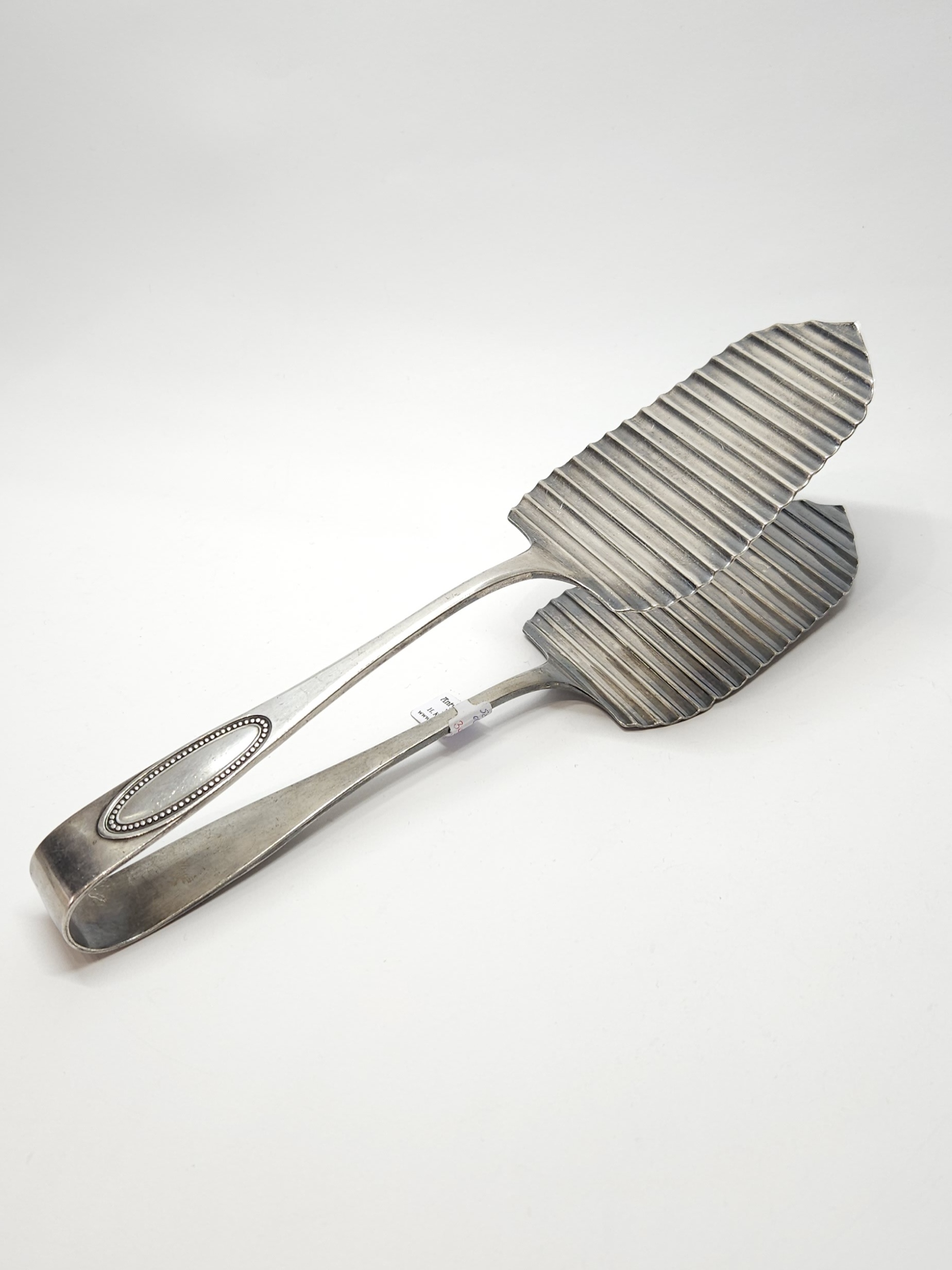 Duże, posrebrzane szczypce ze spłaszczonymi, karbowanymi czerpakami, do serwowania z półmiska
