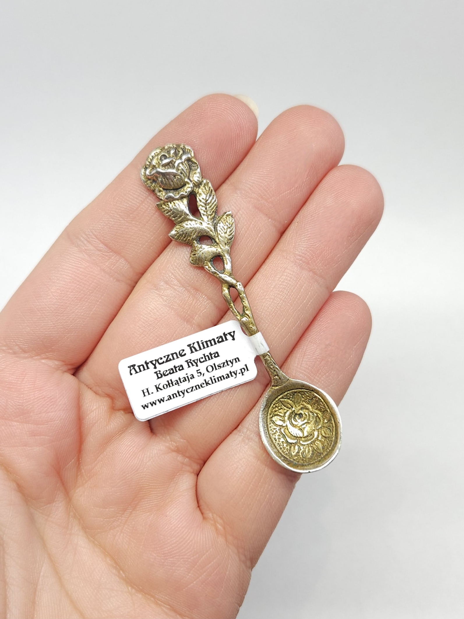 Strona główna » Sklep » Pozłacana łyżeczka z różą do przypraw, srebro złocone 0,800 dł. 6,9cm