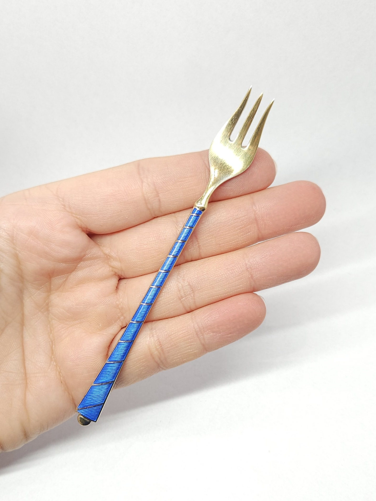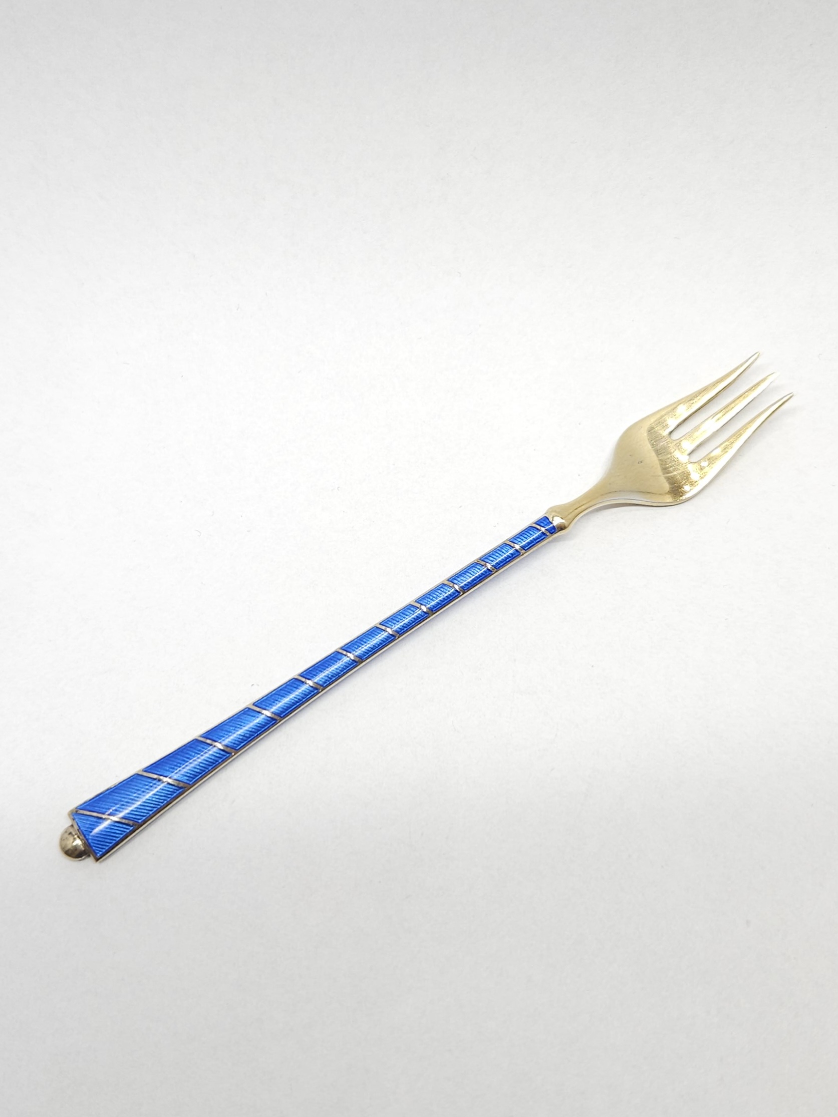 Drobny, srebrny, pozłacany widelczyk z uchwytem dwustronnie zdobiony ciemnoniebieską emalią; z racji wieku widoczne nieznaczne ubytki emalii z tyłu (jaśniejsze wgłębienia widoczne na zdjęciu)
