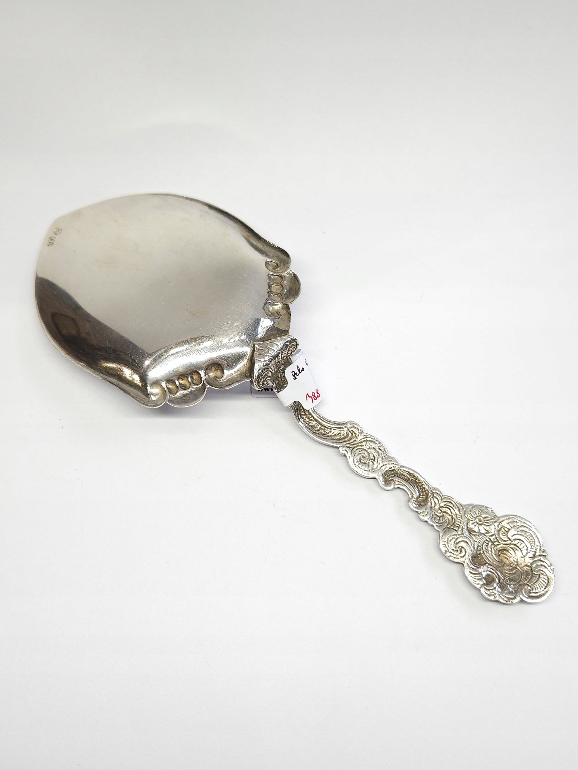Krótka, srebrna łopatka do deserów z bogato zdobionym uchwytem; z racji wieku widoczne drobne mikroryski