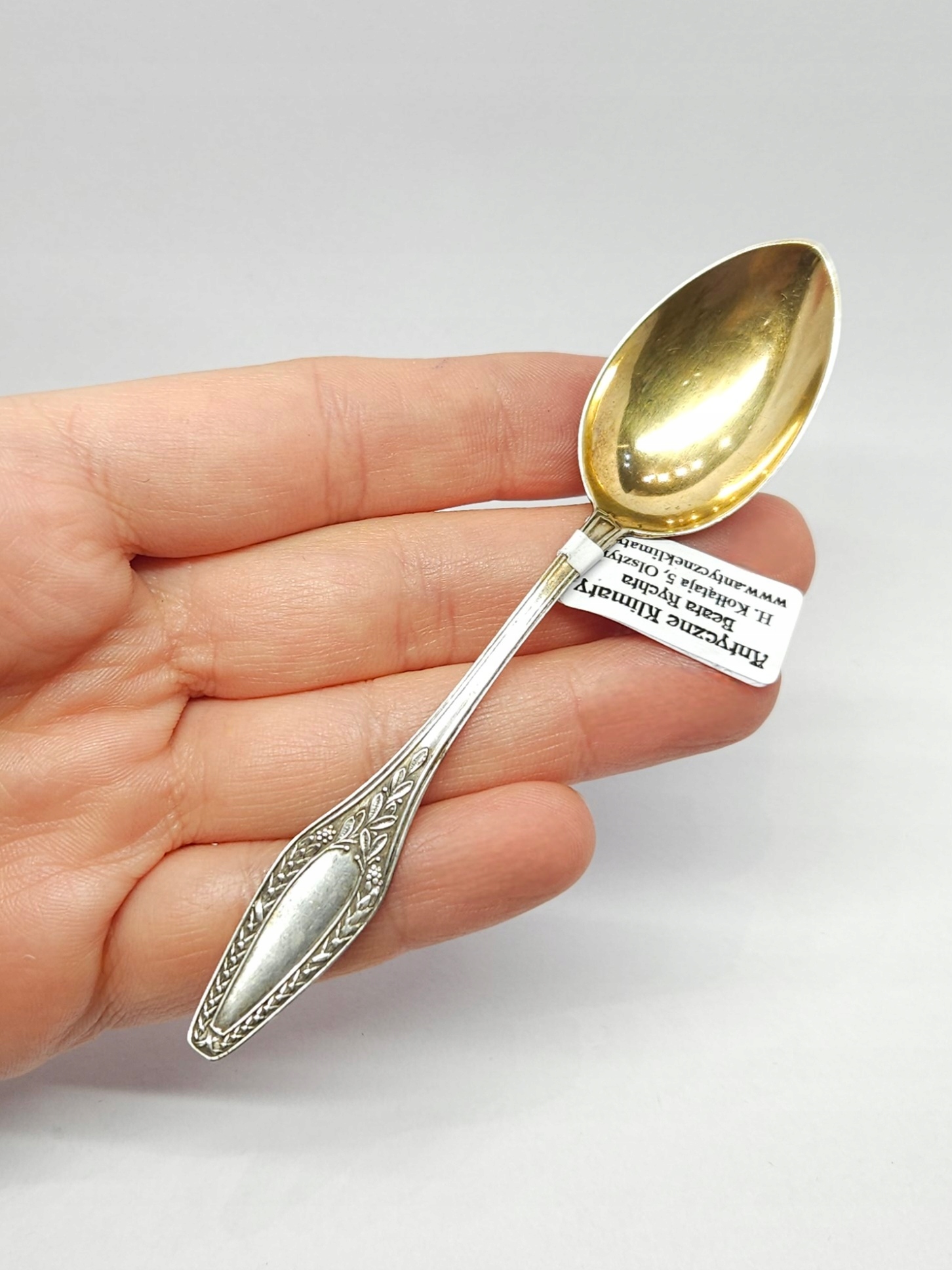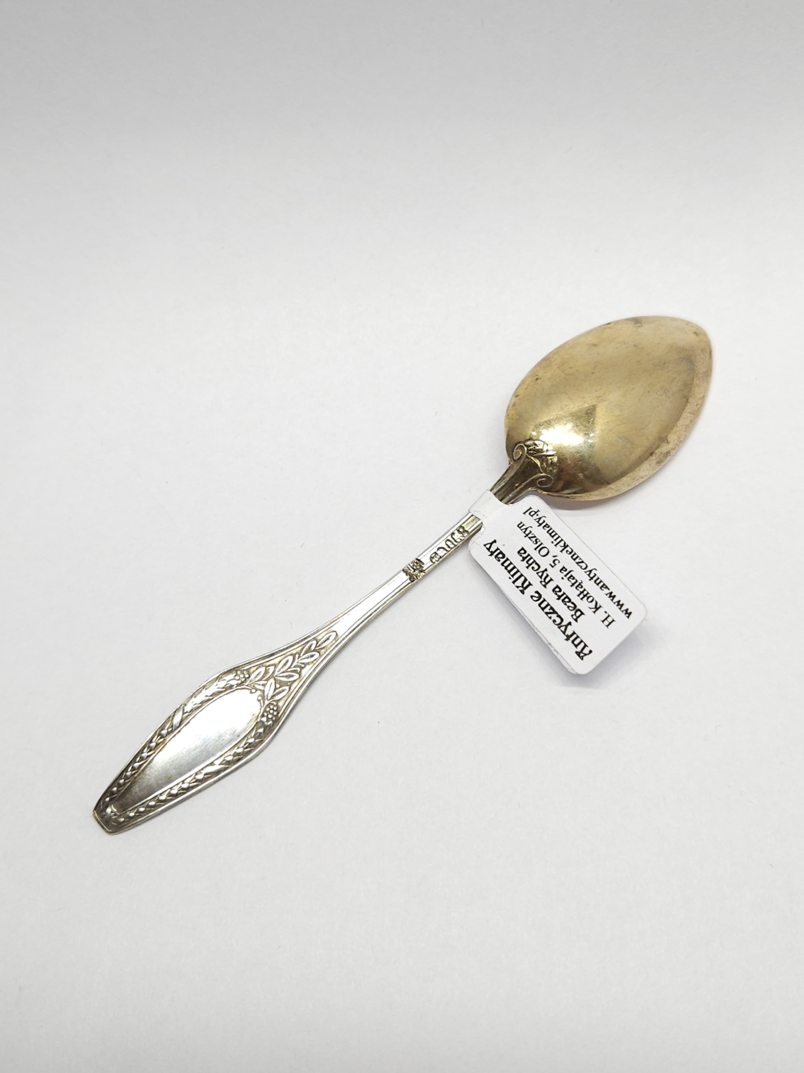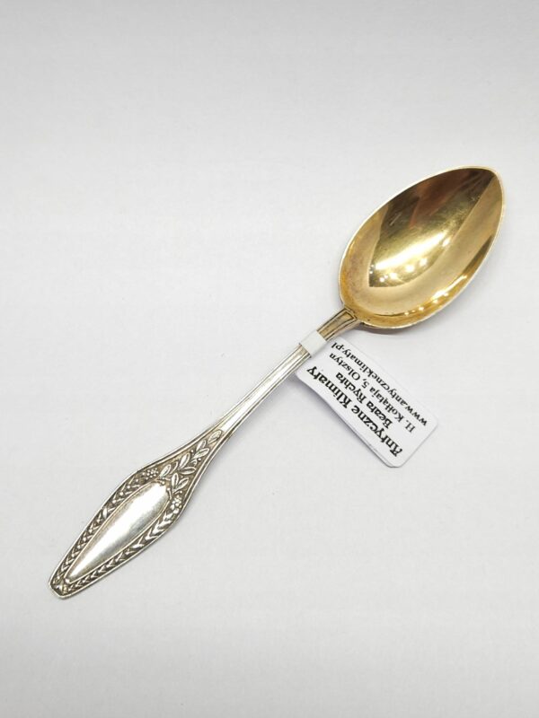 Srebrna łyżeczka z pozłacanym czerpakiem i uchwytem dwustronnie zdobionym motywem roślinnym