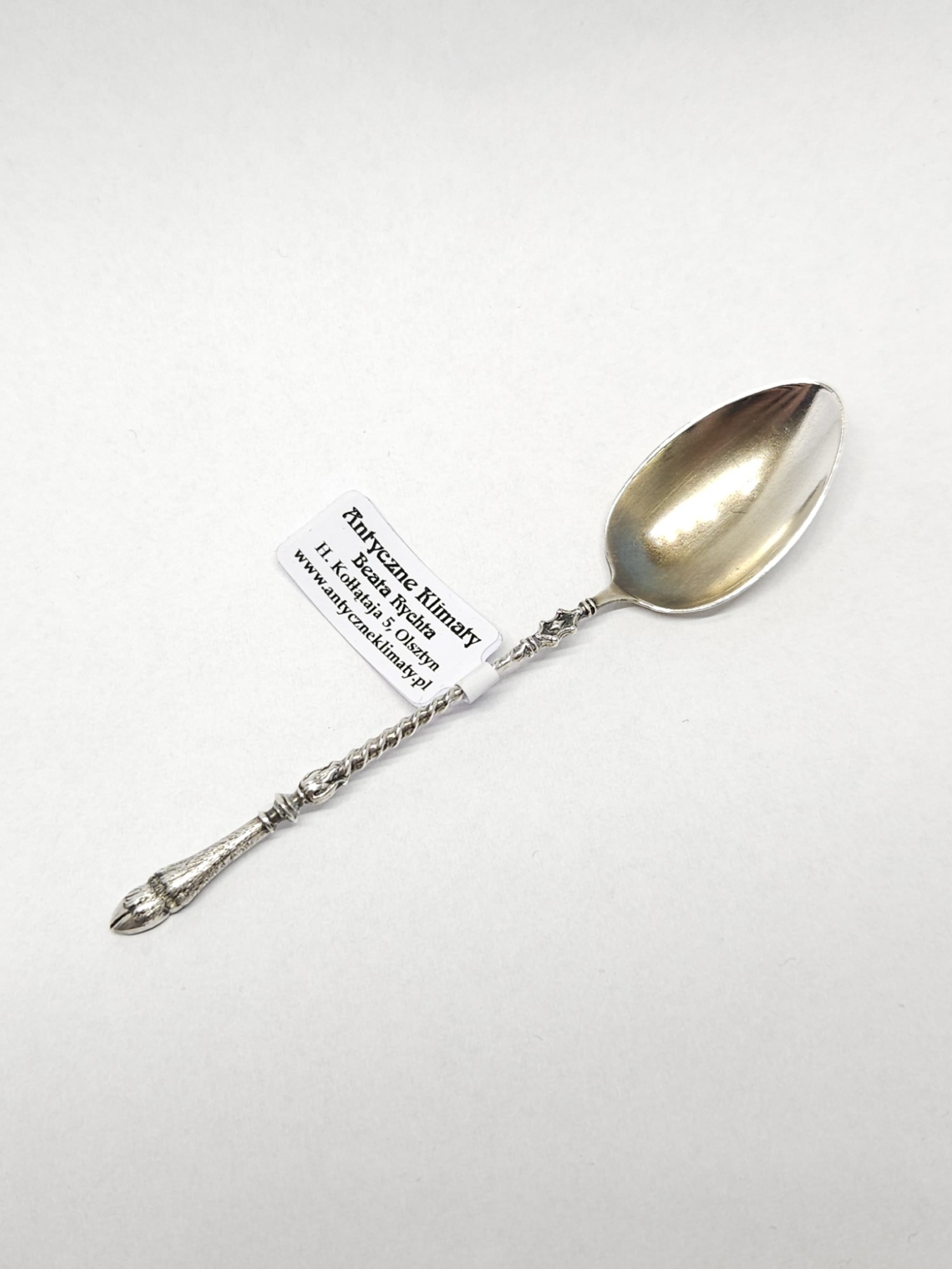 Delikatna, srebrna łyżeczka do mokki, z delikatnie złoconym czerpakiem oraz skręconym uchwytem zakończonym motywem racicy; z racji wieku możliwe mikroryski oraz przyciemnienia srebra