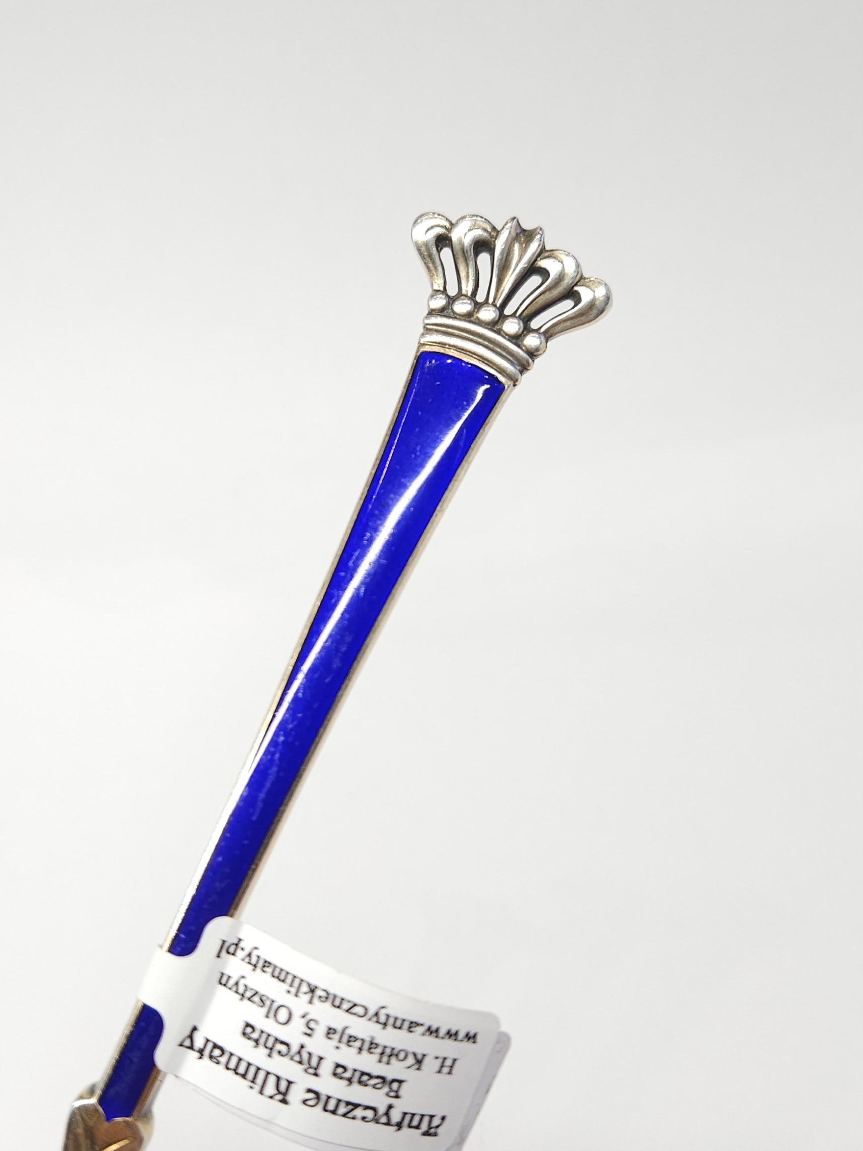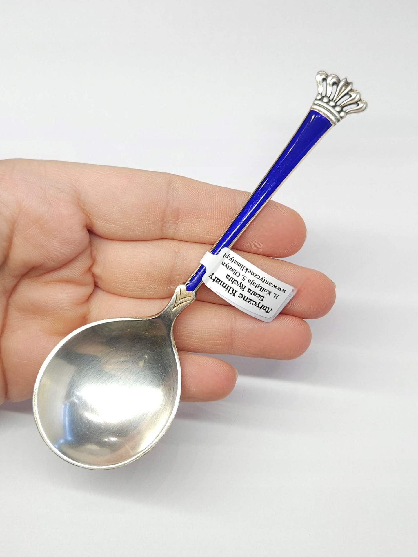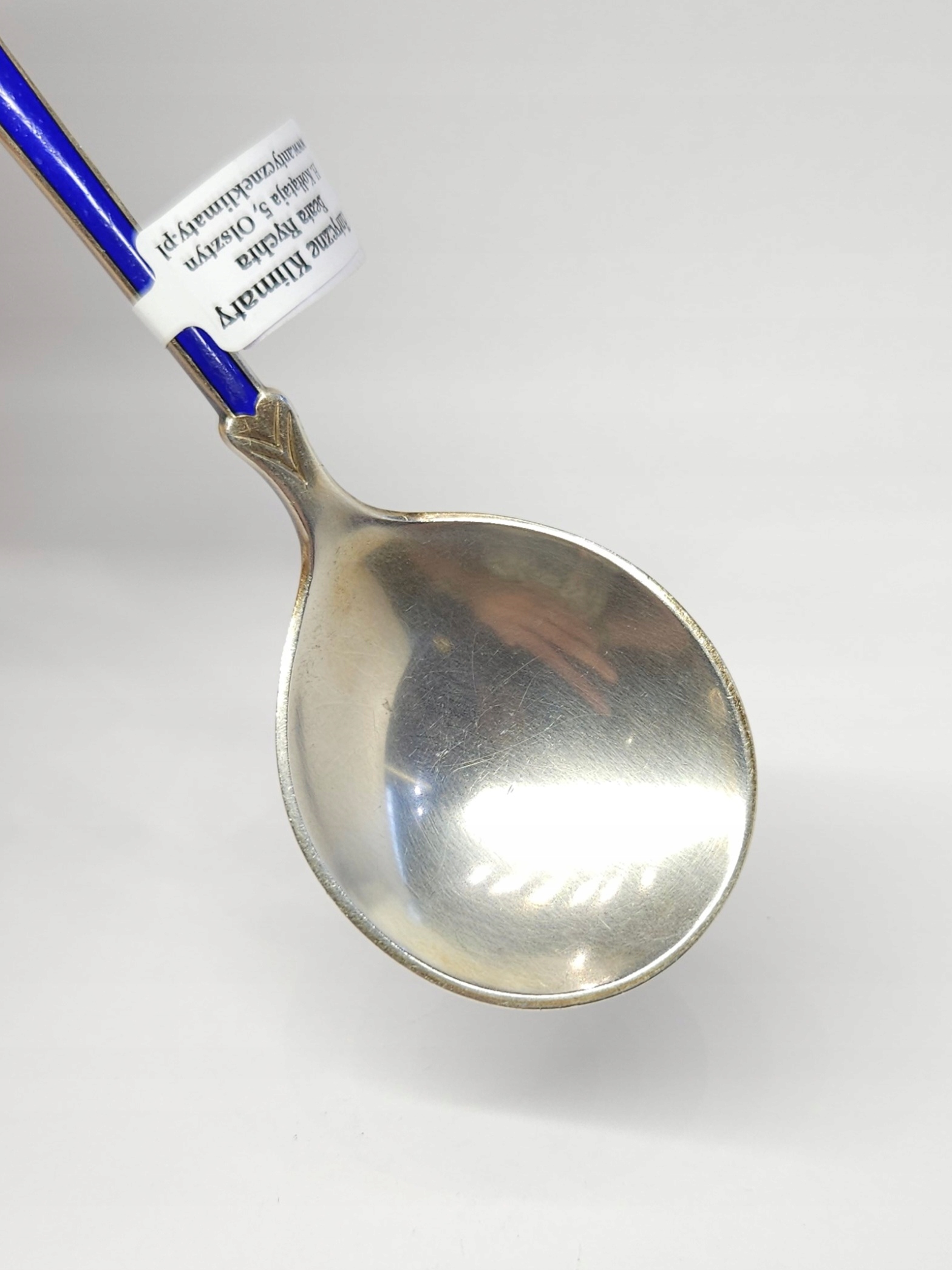 Srebrna łyżeczka z szerokim czerpakiem, z uchwytem zdobionym kobaltową emalią, zakończonym koroną; Dania – Egon Lauridsen; z racji wieku widoczne drobne ślady użytkowania