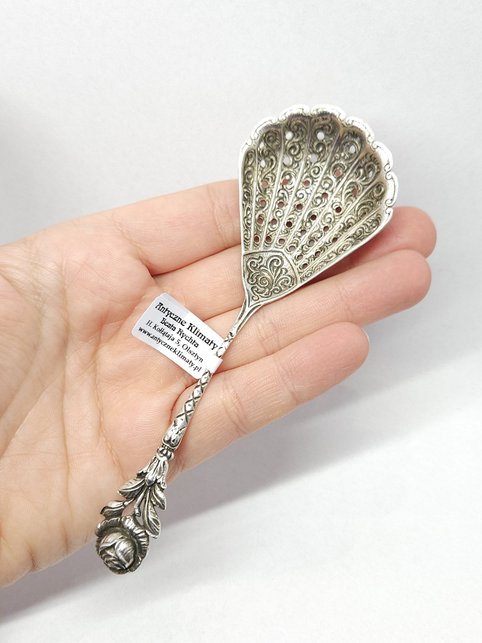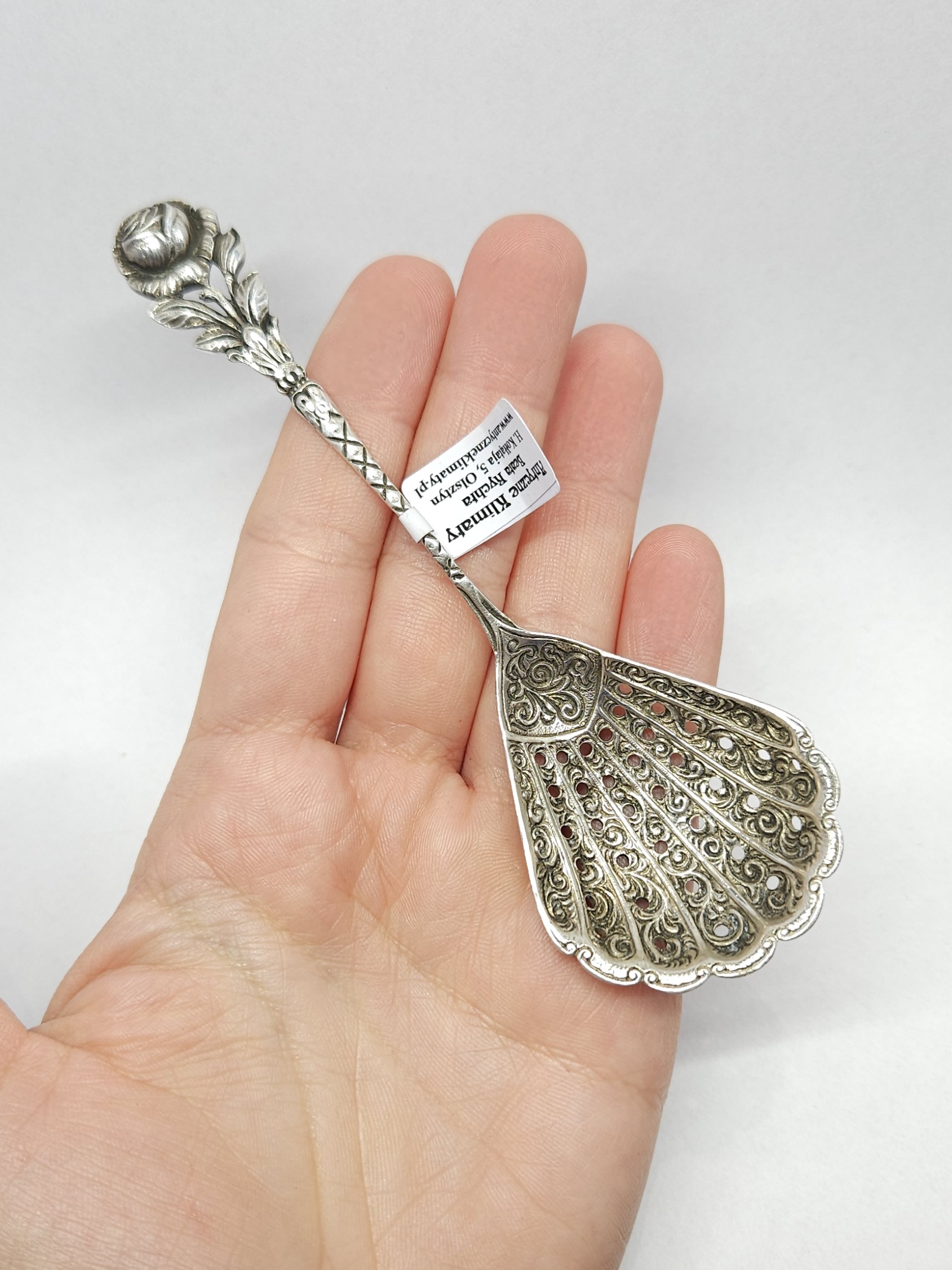 Strona główna » Sklep » Srebrna łyżeczka z szerokim, ażurowym czerpakiem, róża, srebro 0,800