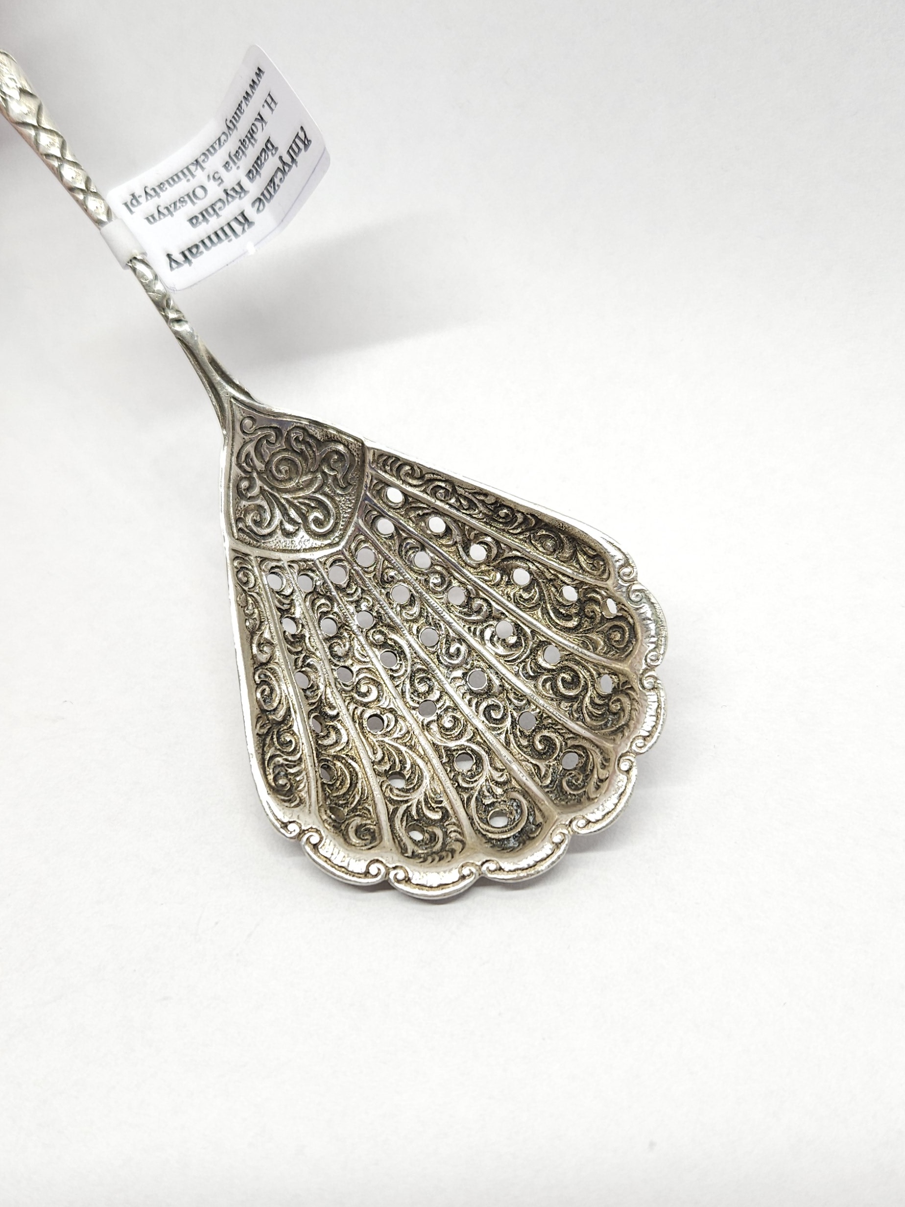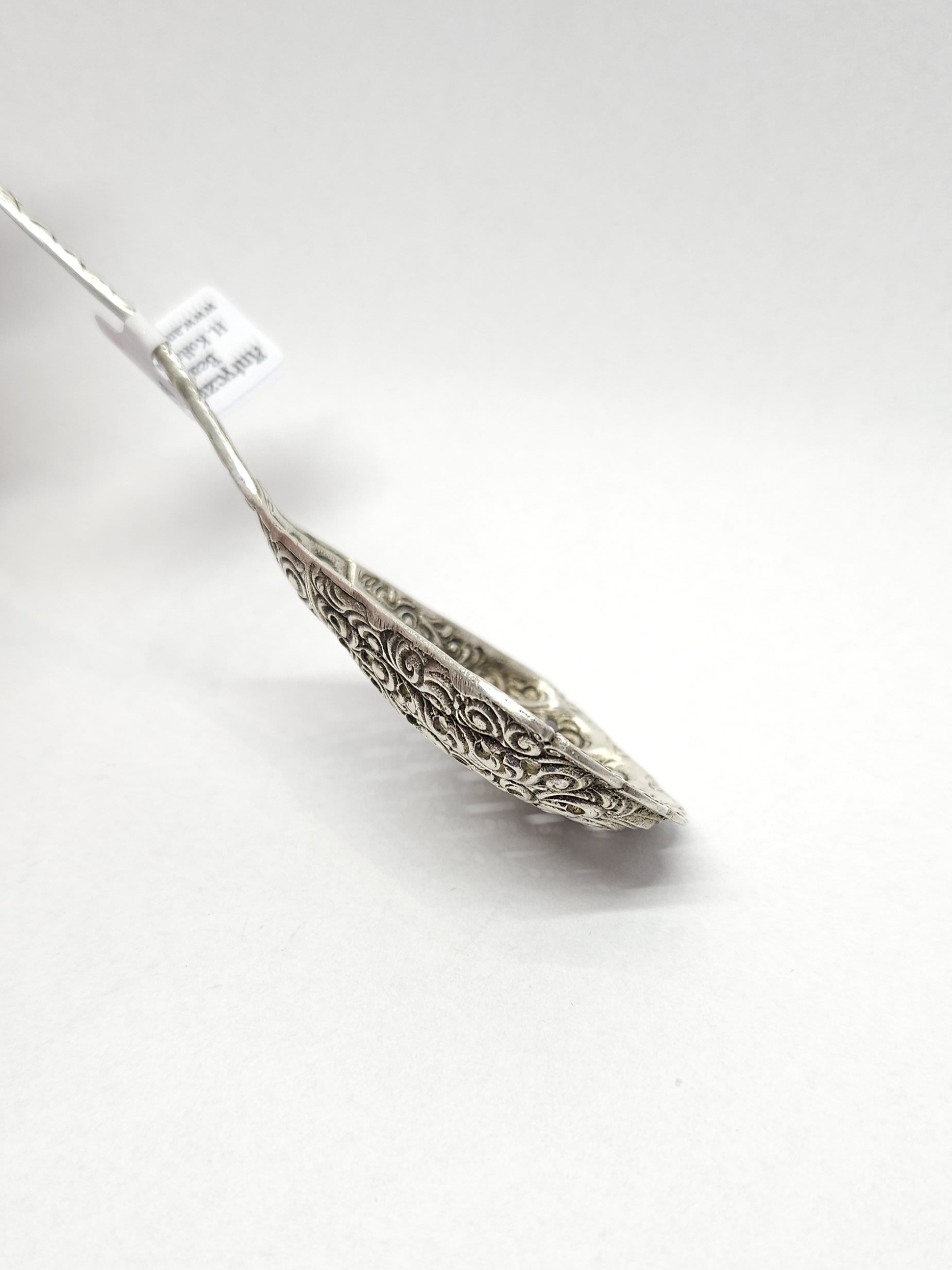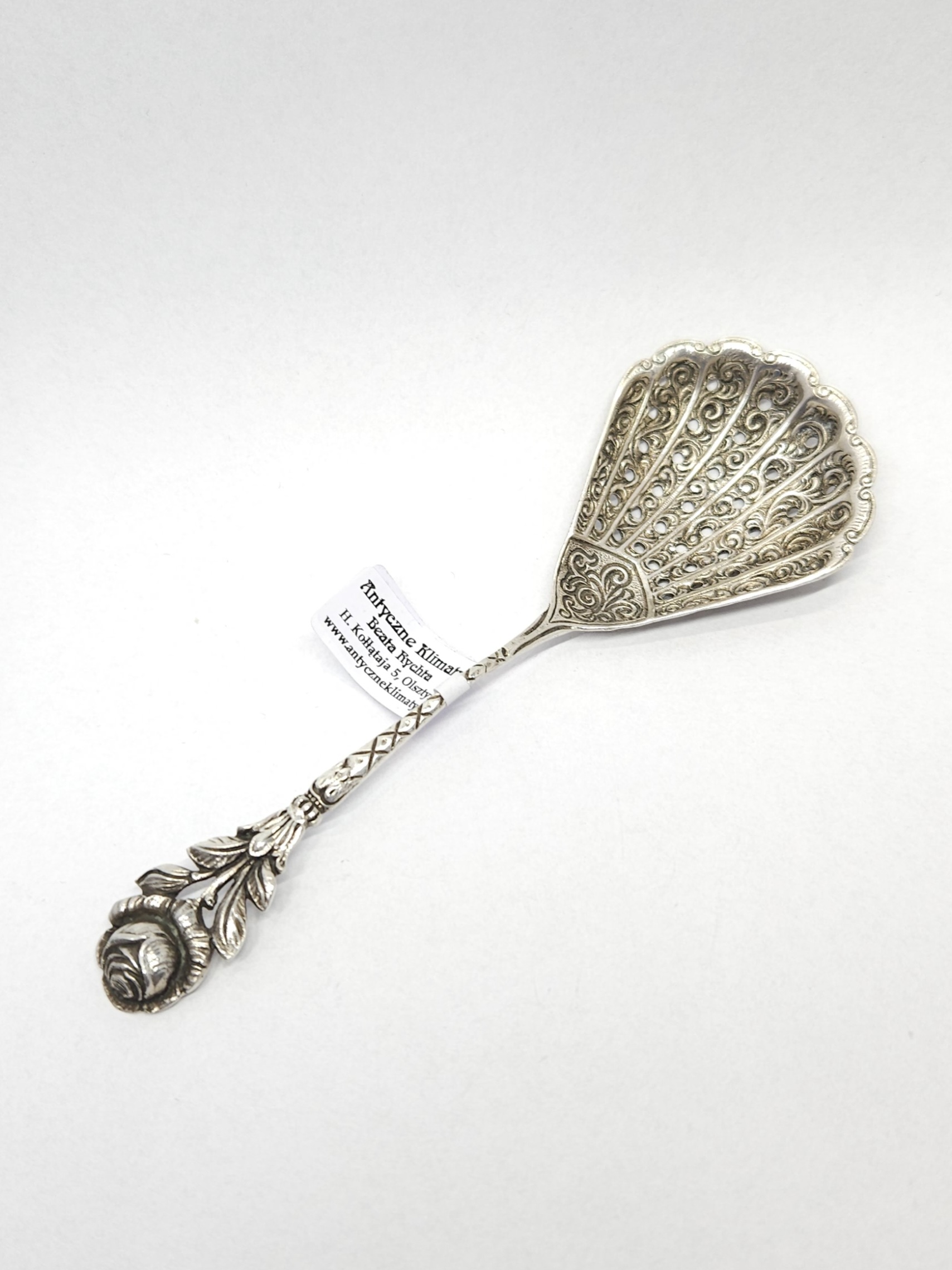 Srebrna łyżeczka, z szerokim, bogato zdobionym, ażurowym czerpakiem oraz uchwytem zakończonym motywem róży