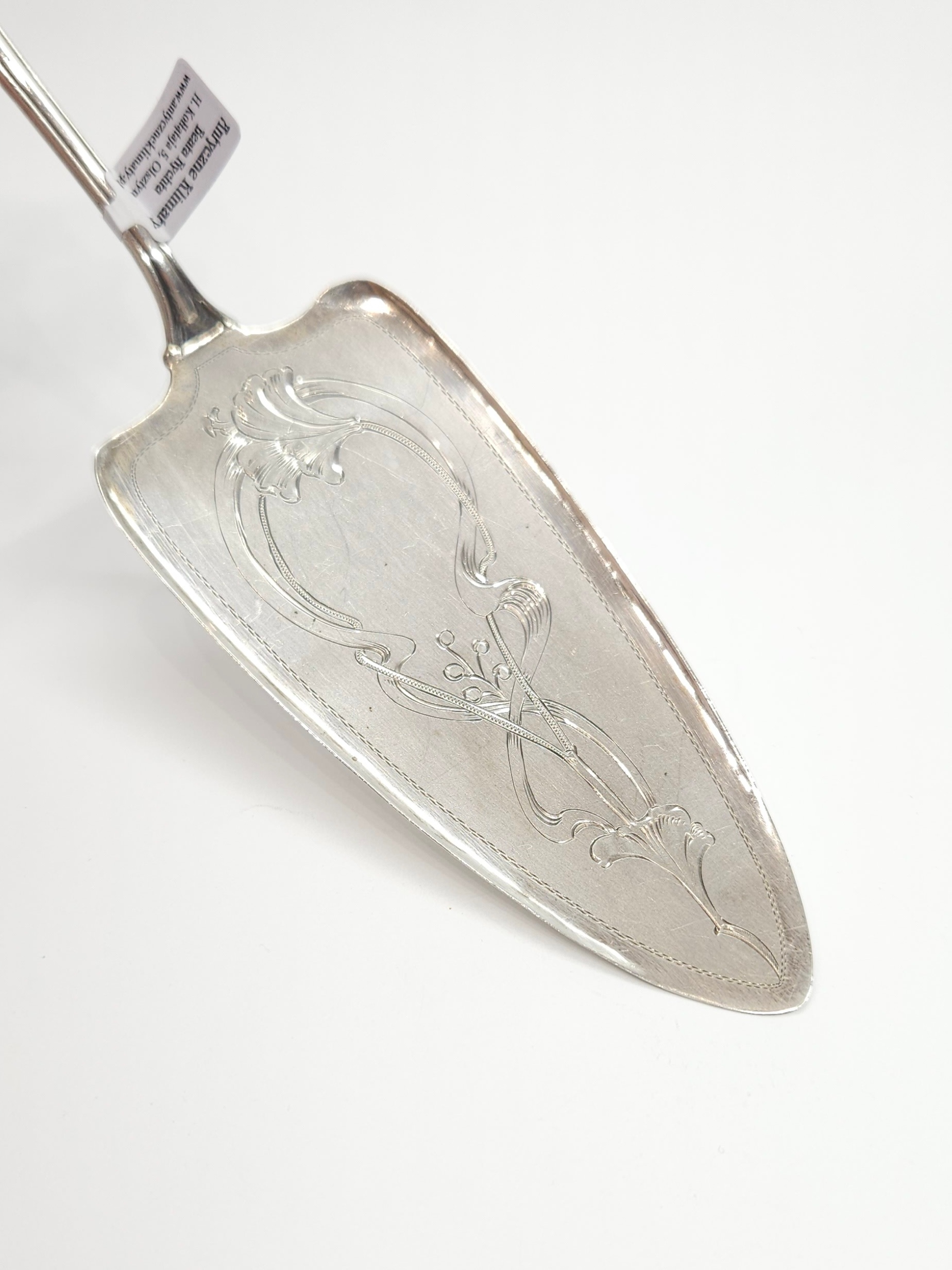 Srebrna łopatka do deserów, z pocz. XXw., zdobiona secesyjnym, roślinnym ornamentem dekoracyjnym, z grawerowanym czerpakiem; z racji wieku możliwe drobne mikroryski
