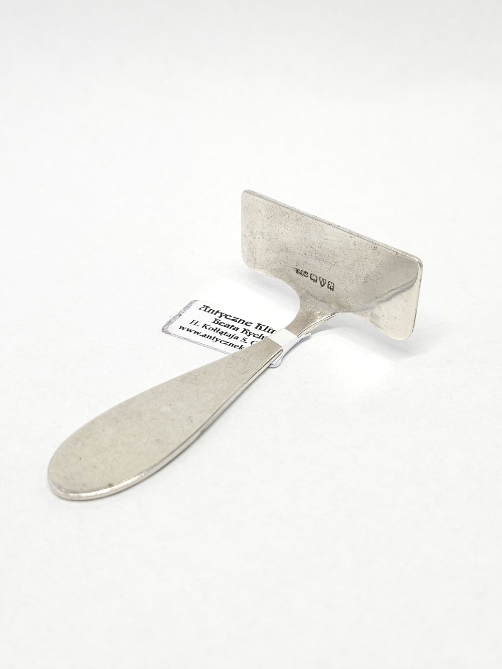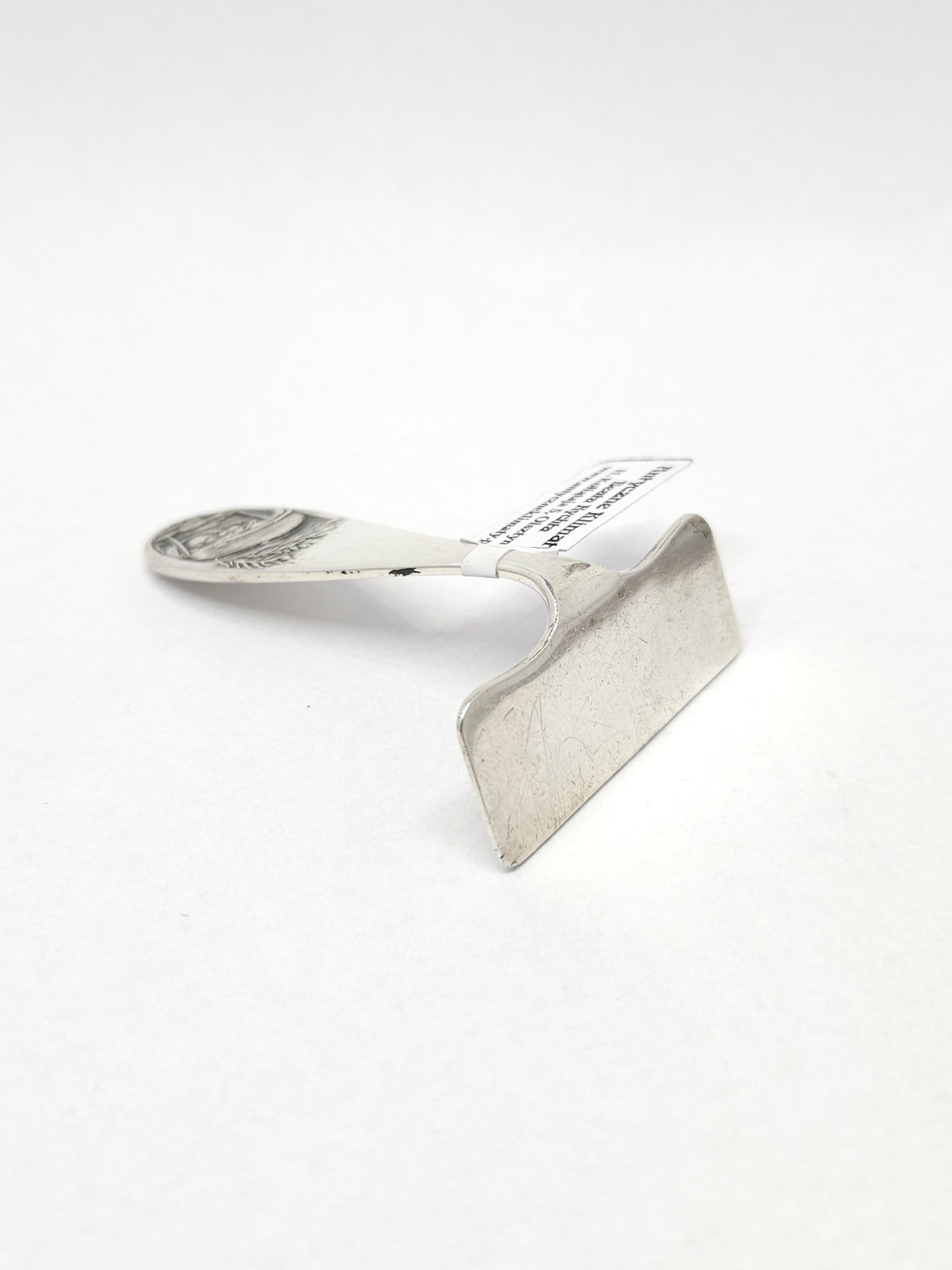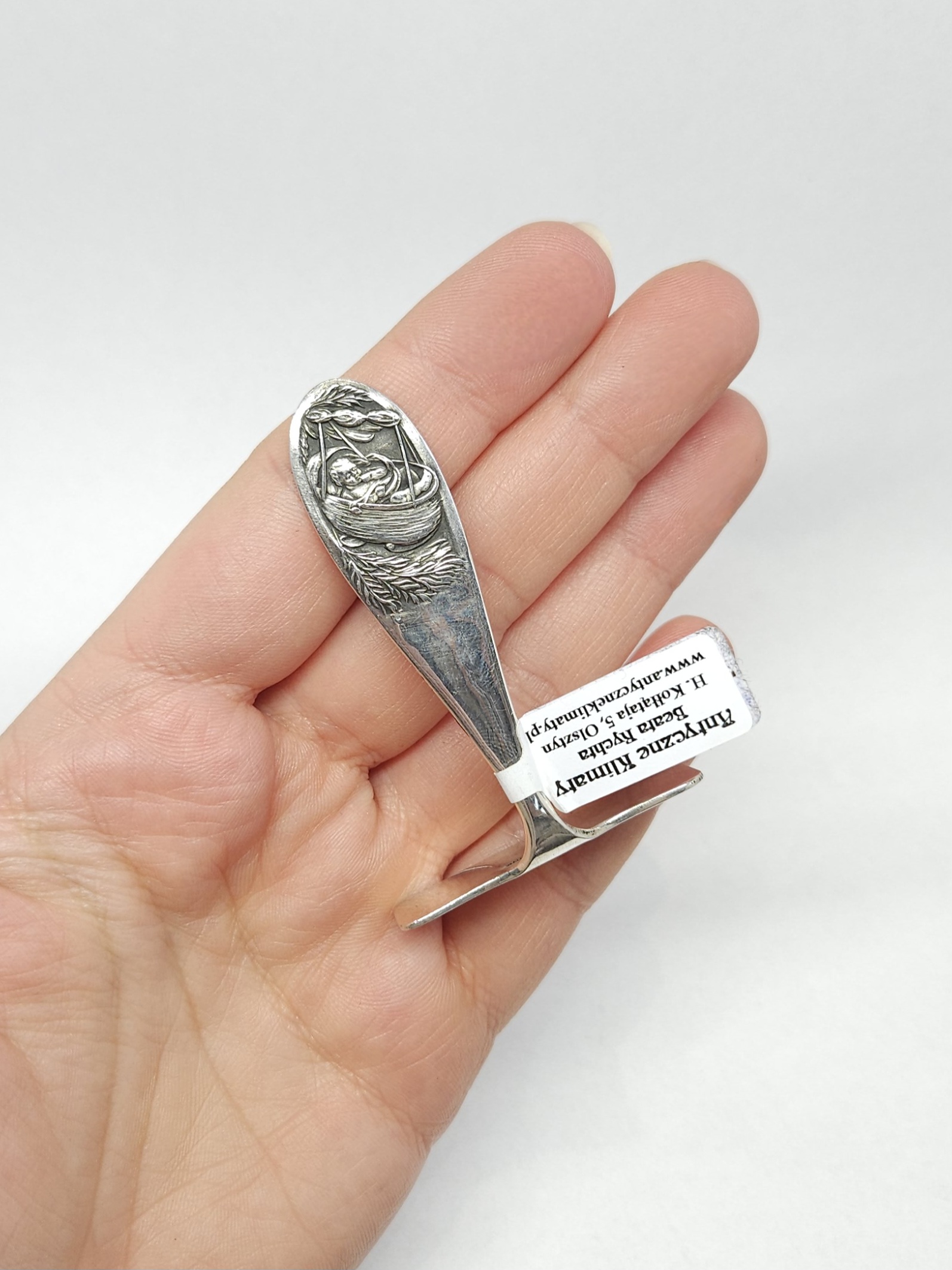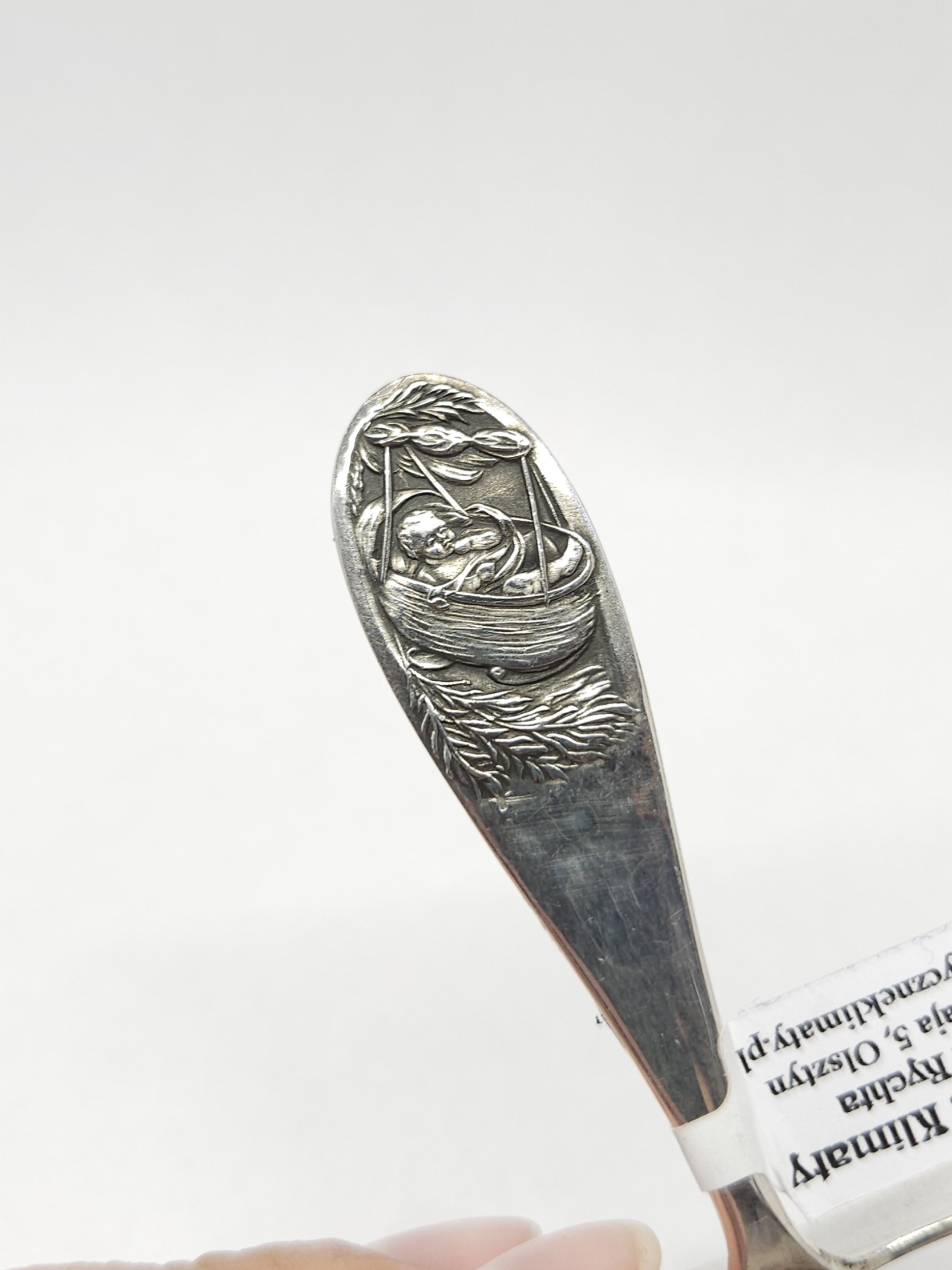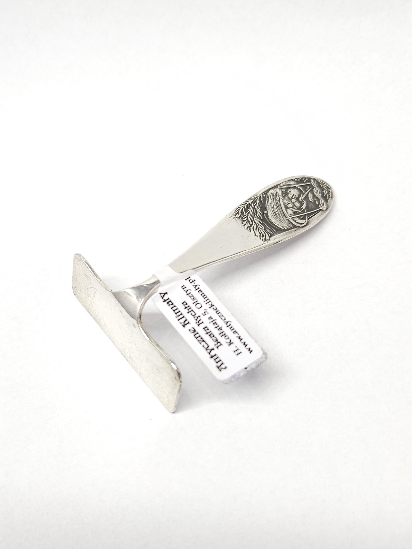Srebrny, krótki popychacz – element dziecięcych sztućców, bez zaostrzonych krawędzi, do nasuwania jedzenia na łyżeczkę… pamiątka na chrzciny